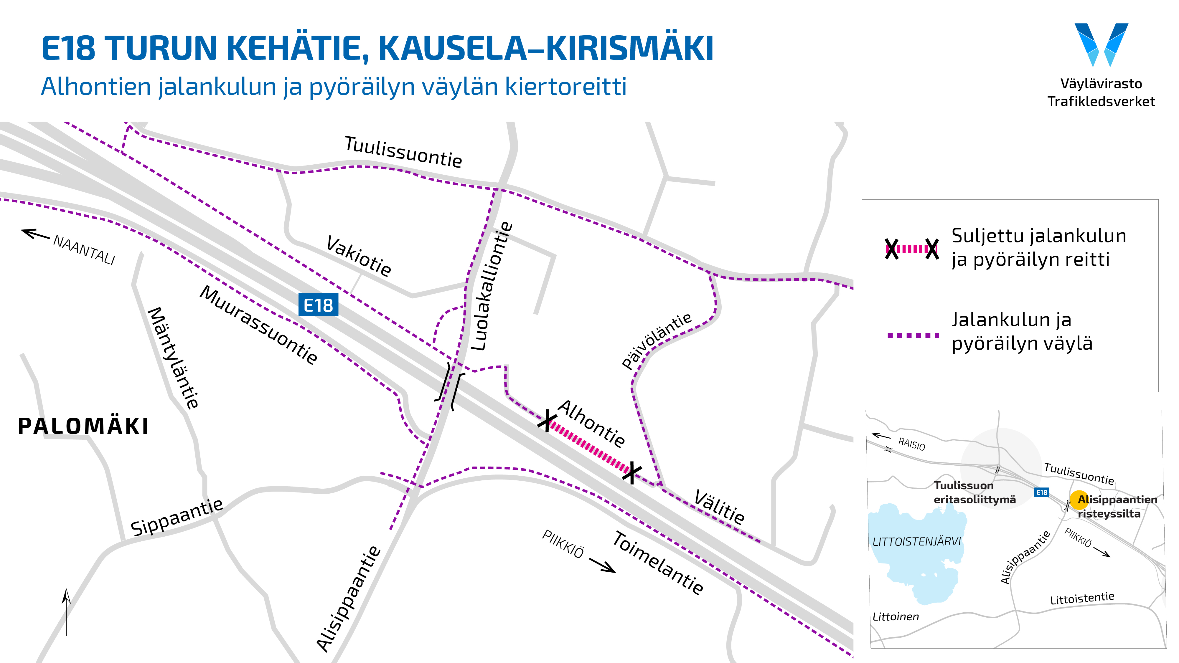 Alhontien jalankulun ja pyöräilyn väylän kiertoreitti ja suljettu osuus