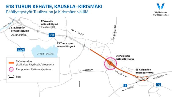 Turun kehätiellä tehdään päällystystöitä 30.8–29.9.2023 osuudella Tuulissuo–Kirismäki. Työn aikana kehätiellä on käytössä vain yksi kaista suuntaansa.