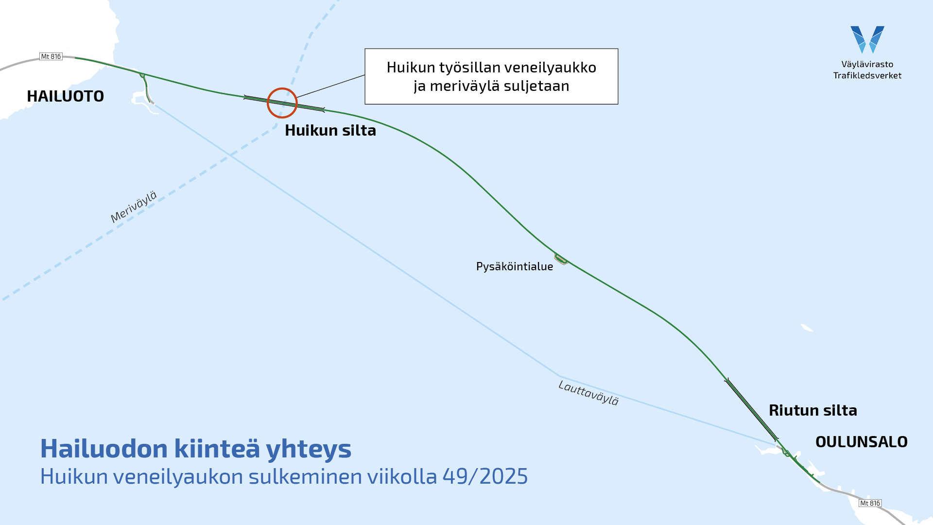 Viikon 49 alussa Hailuodon kiinteän yhteyden työmaalla suljetaan Huikun työsillassa oleva veneilyaukko. Aukko avataan jälleen keväällä.