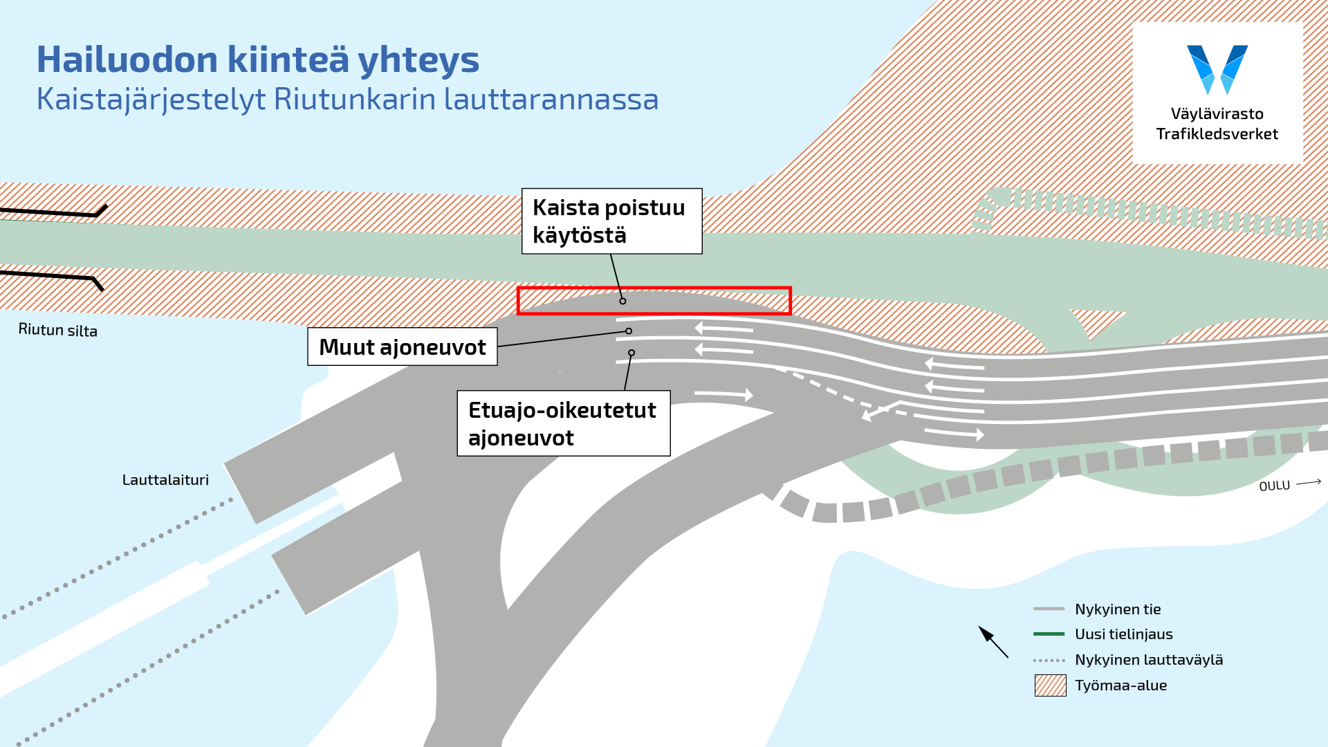 ”Etuajo-oikeutetut ja muut ajoneuvot siirtyvät käyttämään kahta jäljelle jäävää kaistaa. Hälytysajoneuvot ohittavat jonotuskaistat omaa reittiään pitkin”, selvittää Hailuodon kiinteä yhteys -hankkeen projektipäällikkö Jukka Päkkilä Väylävirastosta.