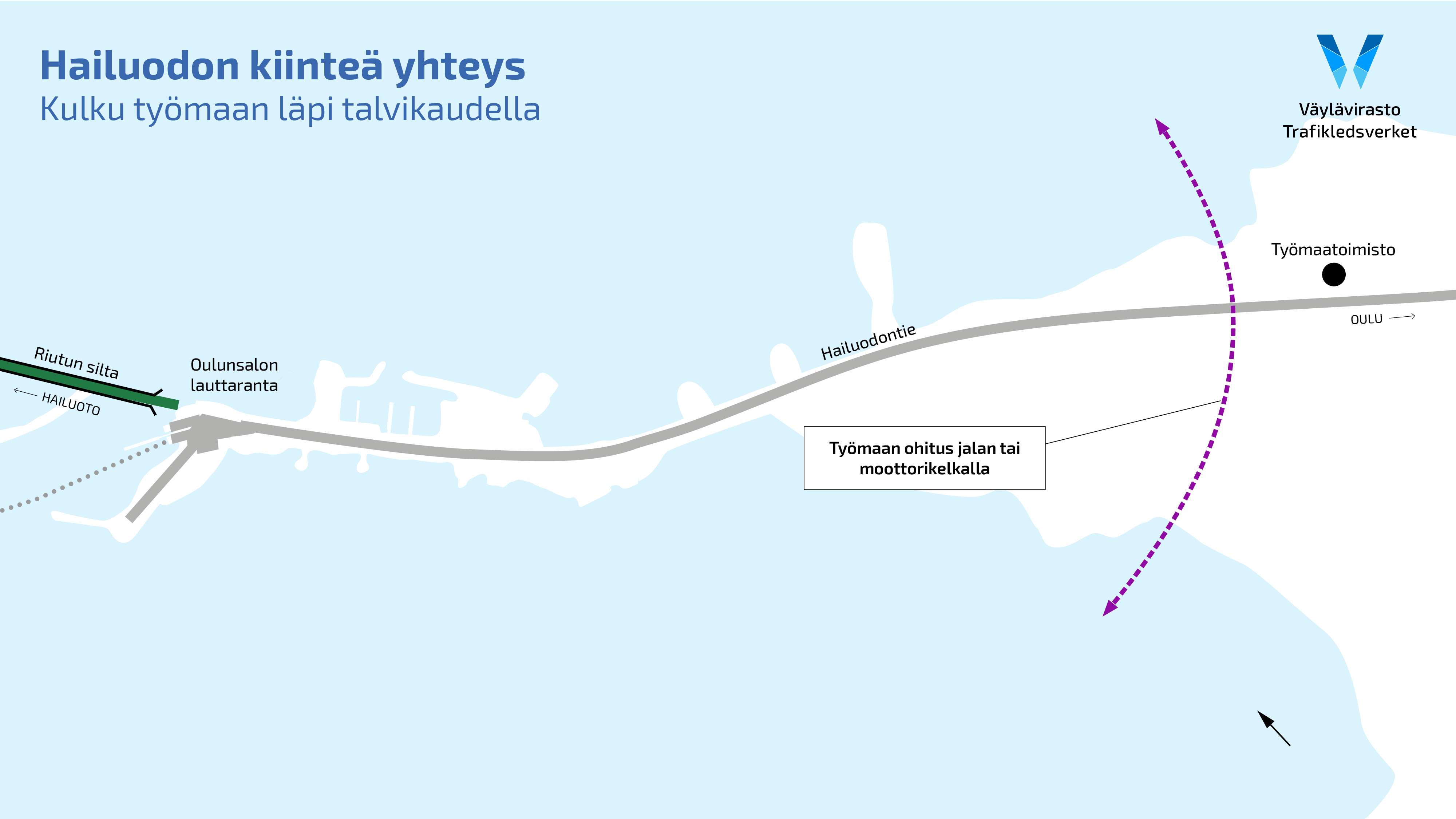 Työnaikaiset veneilyaukot Huikun työsillassa ja Riutun siltapaikan läheisyydessä on suljettu talveksi. Jäällä liikkujat voivat talvikaudella ohittaa työmaan oheiseen karttaan merkittyä reittiä pitkin yhteyden mantereen puoleisessa päässä. Ohitusreitin käyttäjien tulee muistaa väistää Hailuodontiellä kulkevaa liikennettä.