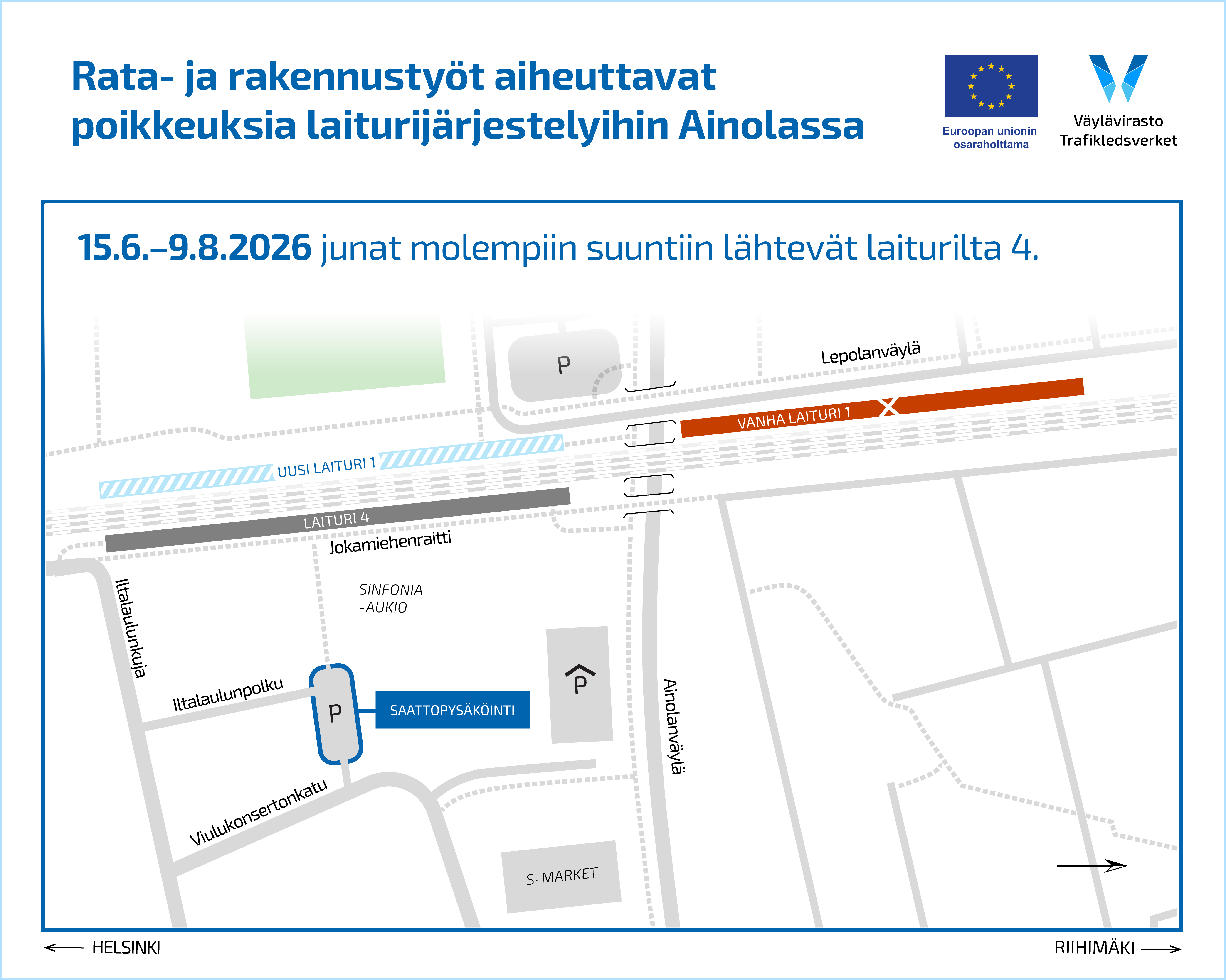 - 15.6.–9.8.2026 kaikki junat molempiin suuntiin käyttävät itäistä laituria 4