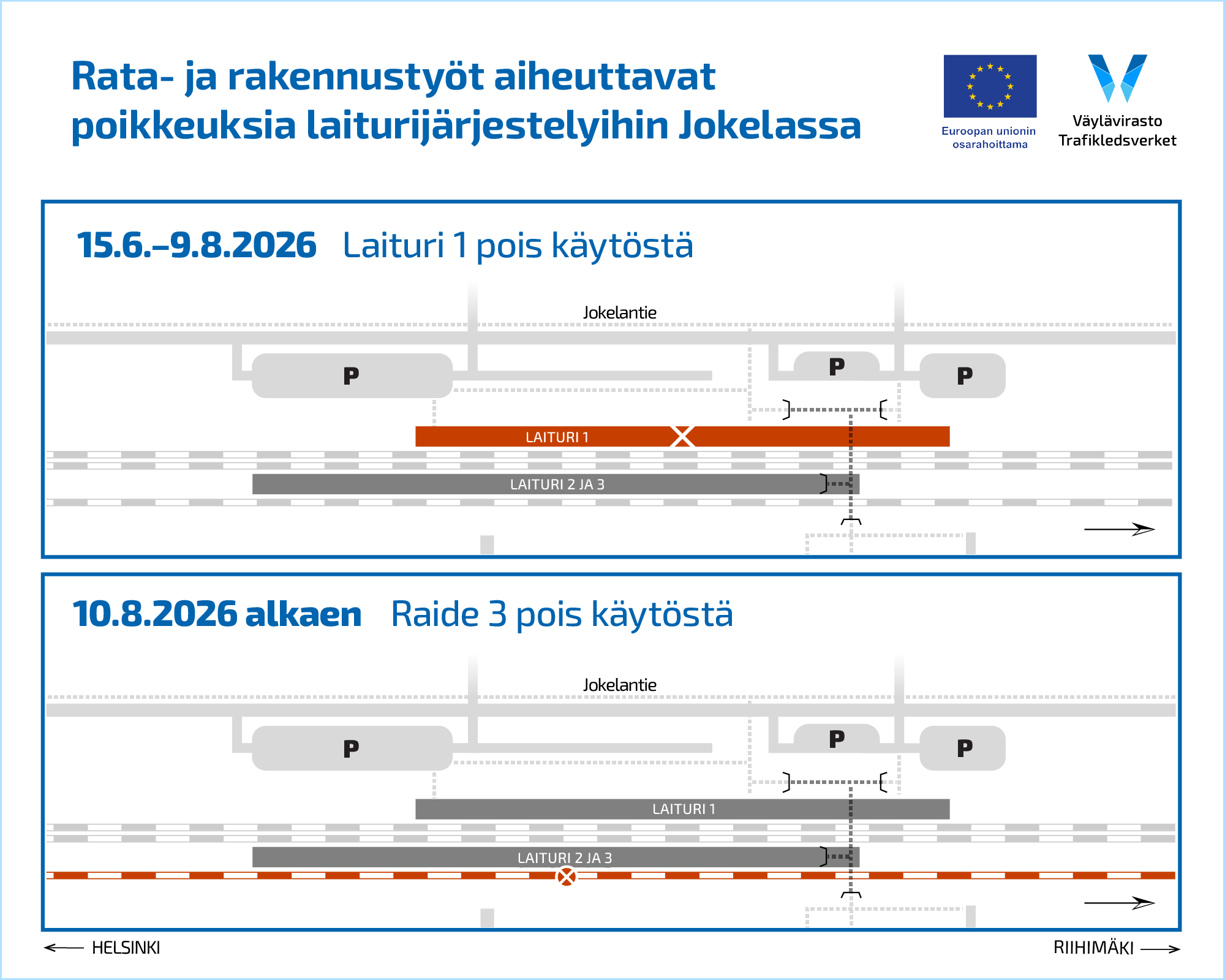”Ensimmäisenä Jokelan alueella rakennetaan sähköratapylväsperustukset, jotta uuden Blennerintien sillan rakentaminen voidaan käynnistää. Jokelan aseman rakennustöiden aikana laitureille kulkemisen ja käytön osalta tulee työnaikaisia muutoksia ja myös joitakin ratakatkoja on tiedossa. Tiedotamme niistä aina hyvissä ajoin. Ensimmäiset muutokset tulevat kesäkuussa, kun laituri 1 poistuu väliaikaisesti käytöstä”, kertoo Parviainen.