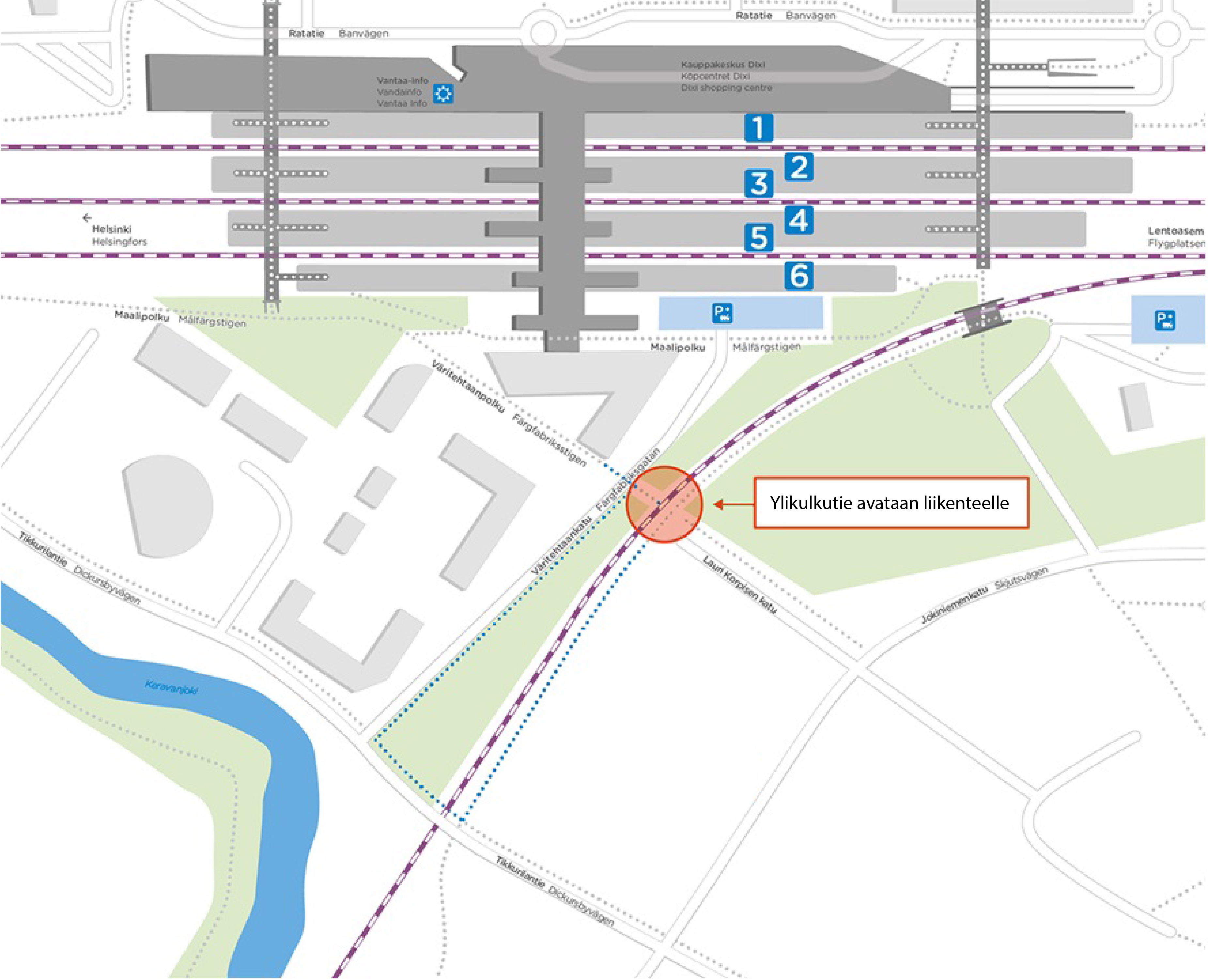 Työt Tikkurilassa ovat viimeistelyä vaille valmiit. Liikenteen palatessa normaaliin 23.10. myös Väritehtaankadun ja Lauri Korpisen kadun välinen ylikulkukäytävä avataan liikenteelle. Ylikulkukäytävä avataan viimeistään tiistaina 24.10., kun liikennejärjestelyt on saatu valmiiksi.