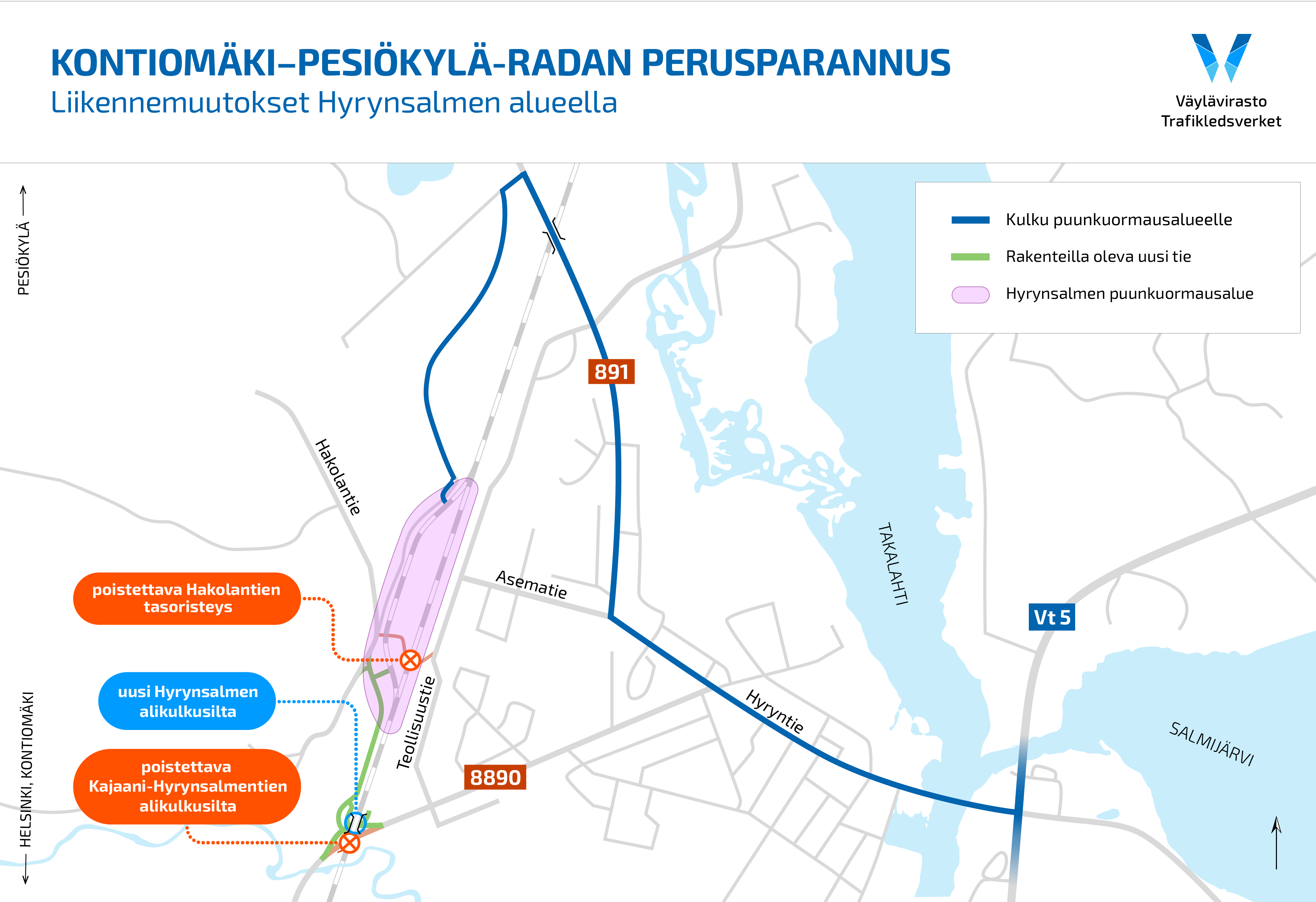 Hyrynsalmelle rakennetaan uusi alikulkusilta korvaamaan nykyisen huonokuntoisen Kajaani–Hyrynsalmentien alikulkusillan. Hyrynsalmen puunkuormausalueelle johtava Hakolantien tasoristeys poistetaan ja liikenne siirretään kulkemaan Puolangantien kautta tulevana sunnuntaina. Työt ovat osa Väyläviraston Kontiomäki–Pesiökylä-radan perusparannushanketta.