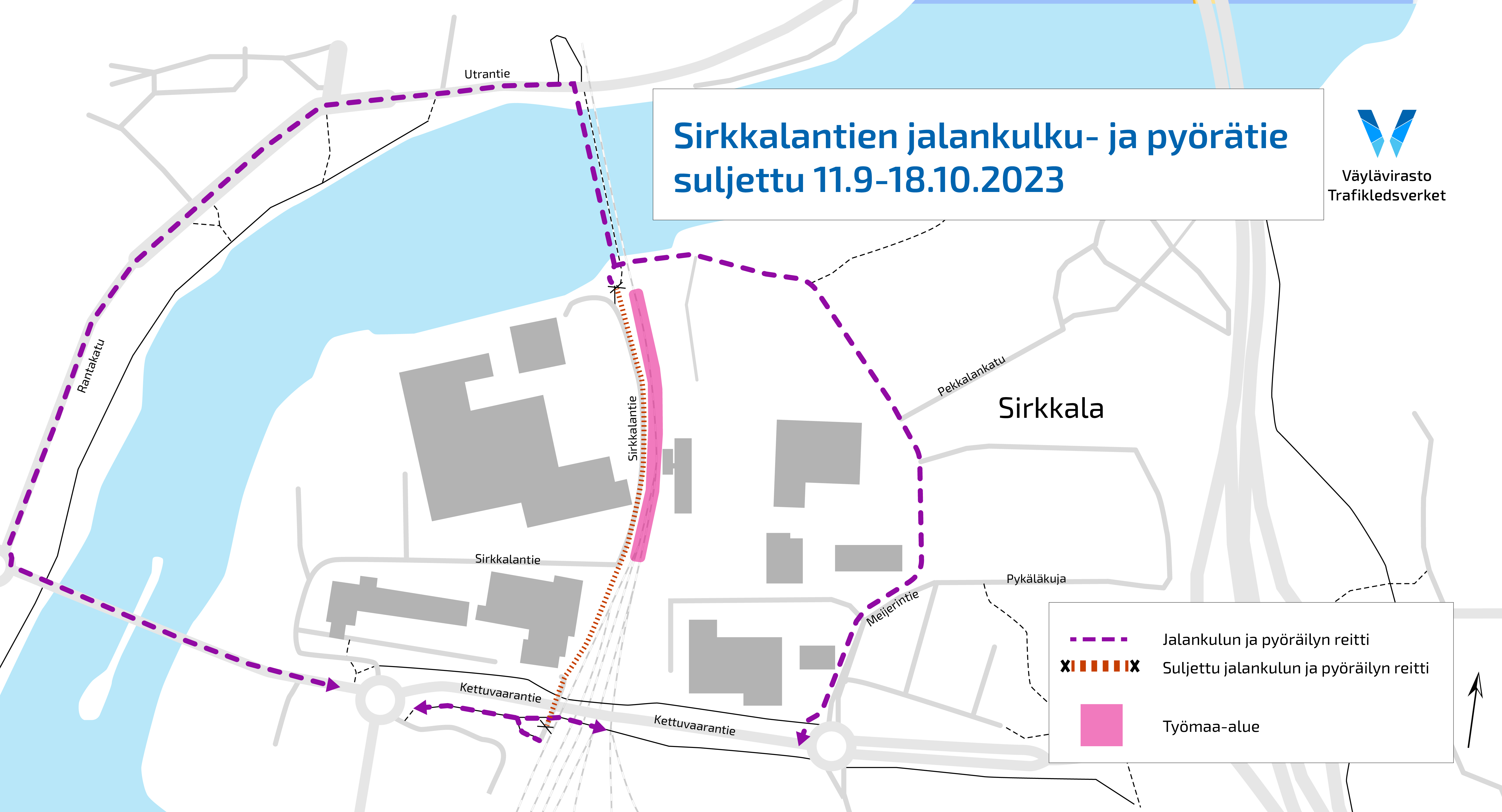 Kävelijät ja pyöräilijät pääsevät kulkemaan Kettuvaarantielle Pekkalankadun ja Meijerintien kautta tai Utrantietä Rantakadulle ja Sirkkalan sillan yli.