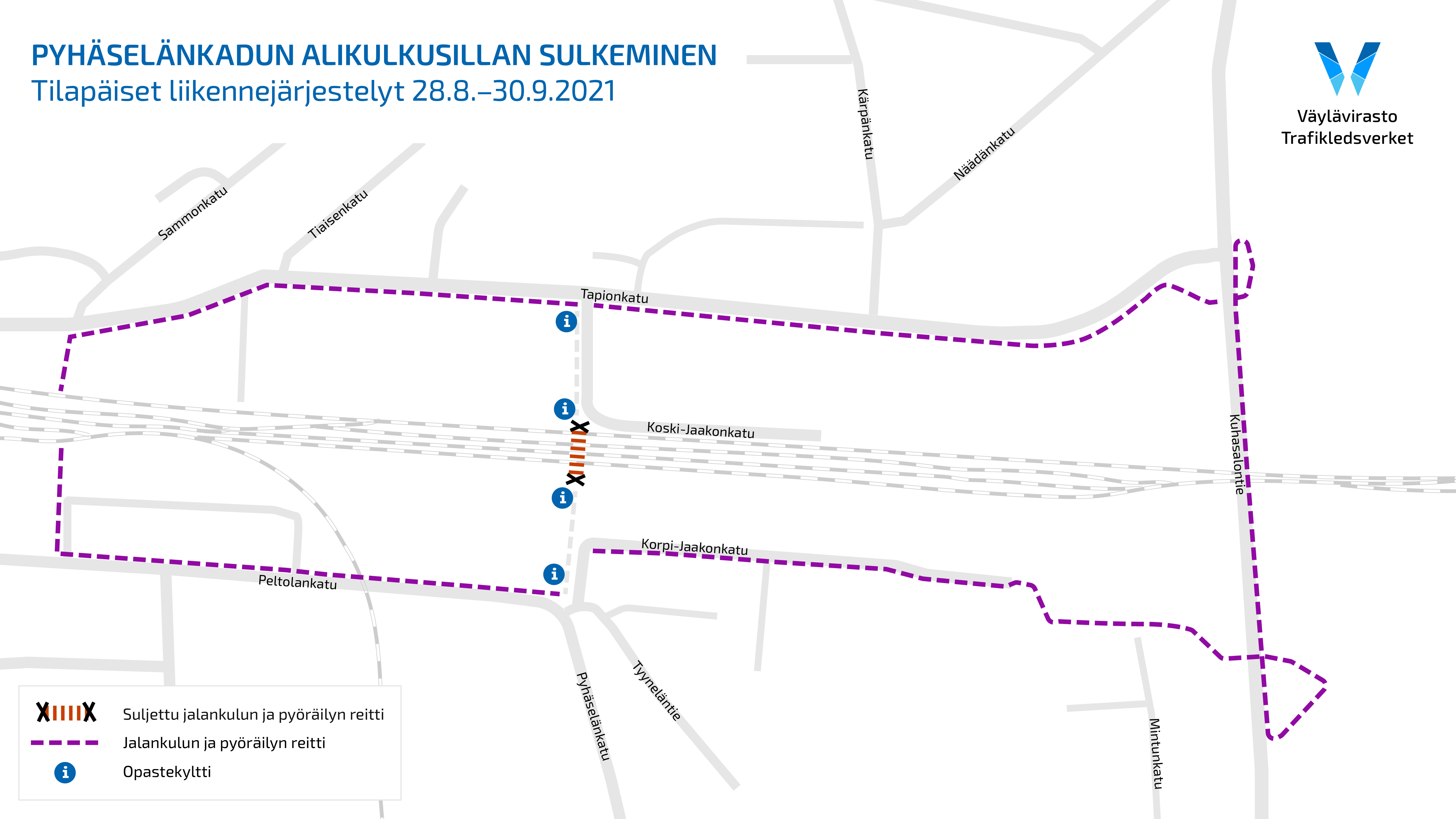 Oheinen kartta kuvaa tilapäisiä liikennejärjestelyjä Pyhäselänkadun alikulkusillan ympäristössä.