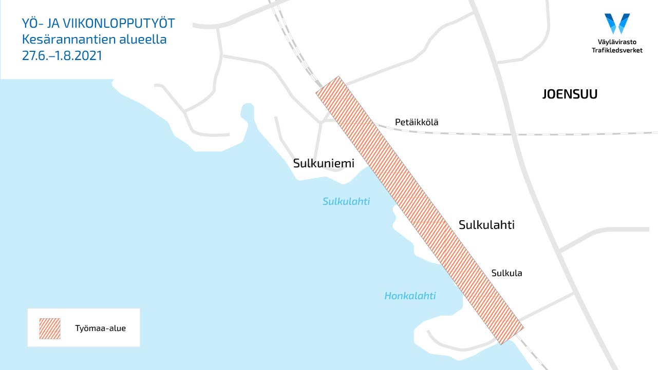 Työhön on saatu melutyölupa Joensuun kaupungin ympäristölautakunnalta. Oheinen kartta kuvaa Kesärannantien yö- ja viikonlopputöiden aluetta kesällä 2021.