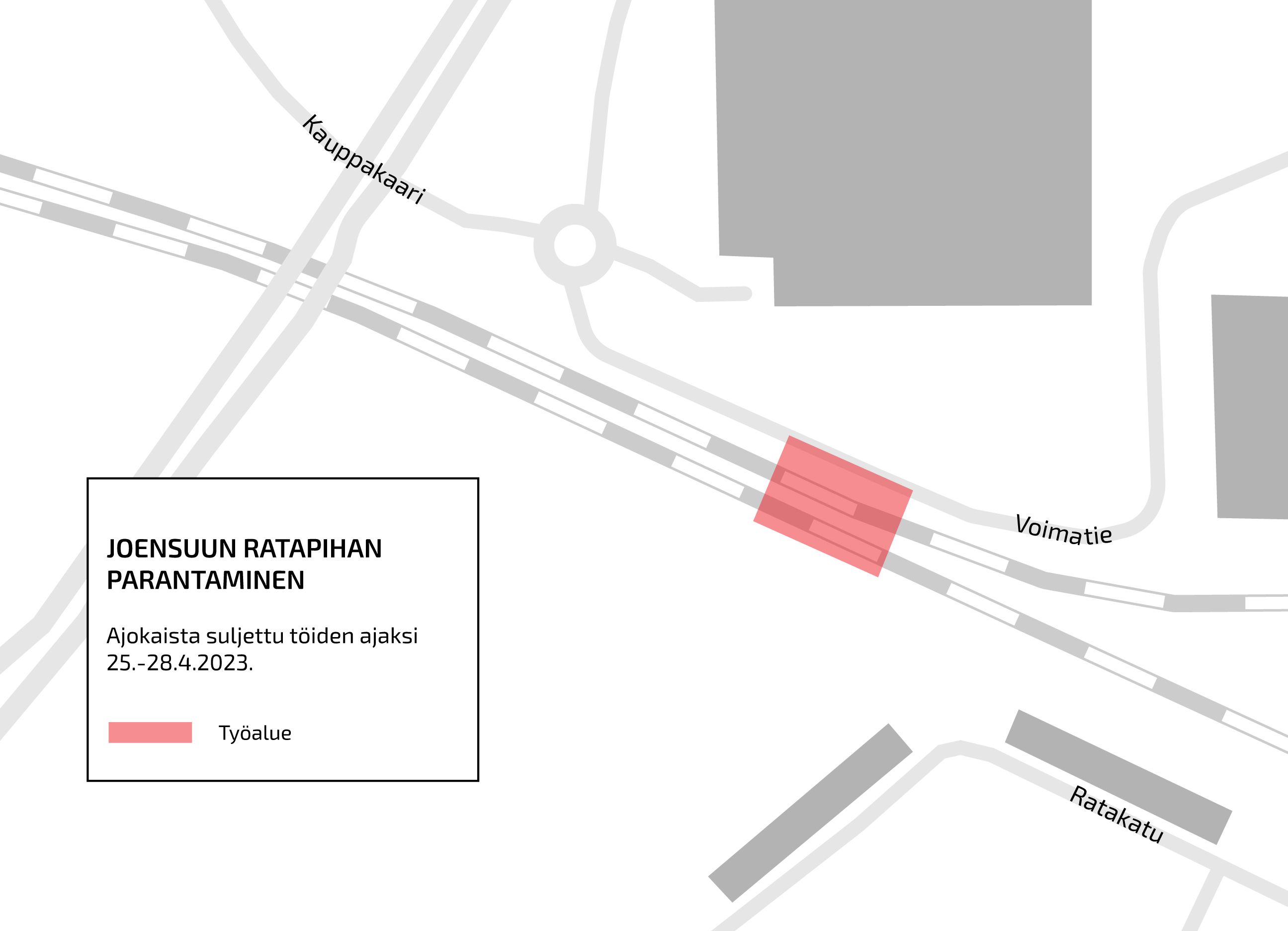 Joensuun ratapihan toimintavarmuutta parannetaan uusilla turvalaitteilla. Turvalaitteita varten tarvittavat kaapelit asennetaan Kontionlahden suuntaan kulkevan junaradan ali Voimatien kohdalla tiistaina 25.4. alkaen. Työn arvioidaan valmistuvan viimeistään perjantaina 28.4.