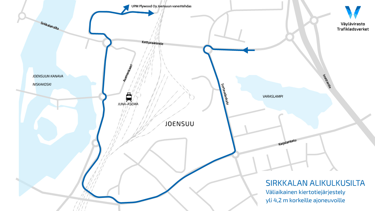 ”Kuorma-autojen ja vastaavien korkeiden ajoneuvojen täytyy kiertää alikulkusilta. Kiertotie on merkitty selkein opastein. Molempiin liikenneympyröihin on asennettu kiertotiemerkinnät ja isot opastekartat”, kertoo hankkeen projektipäällikkö Jetro Matilainen Väylävirastosta.