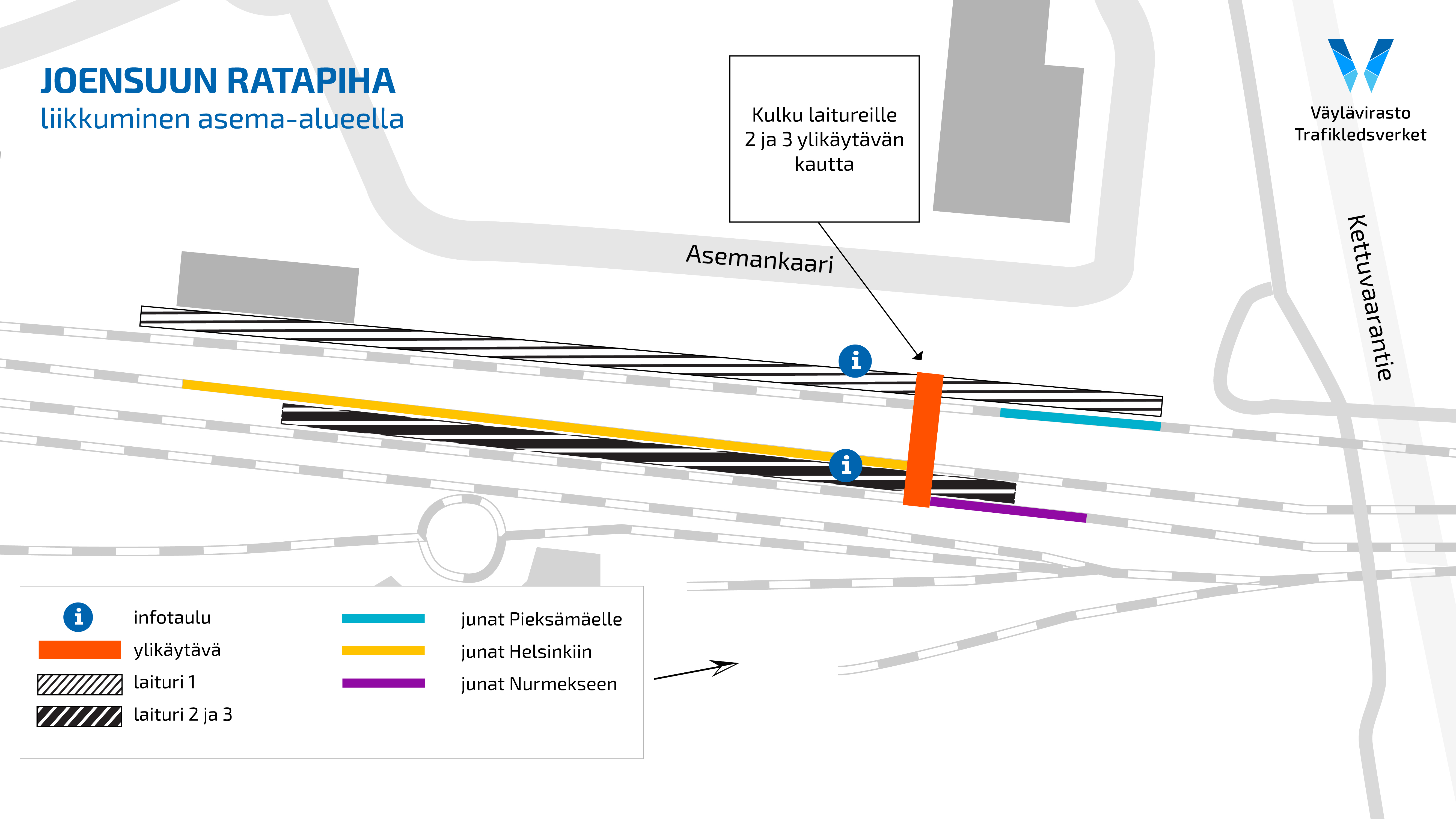Joensuun ratapihan uusi ylikäytävä otetaan käyttöön maanantaina 3.7.2023 klo 8.00. Samalla laiturit 2 ja 3 saadaan takaisin matkustajaliikenteen käyttöön. Kulku välilaitureille tapahtuu ylikäytävän kautta.