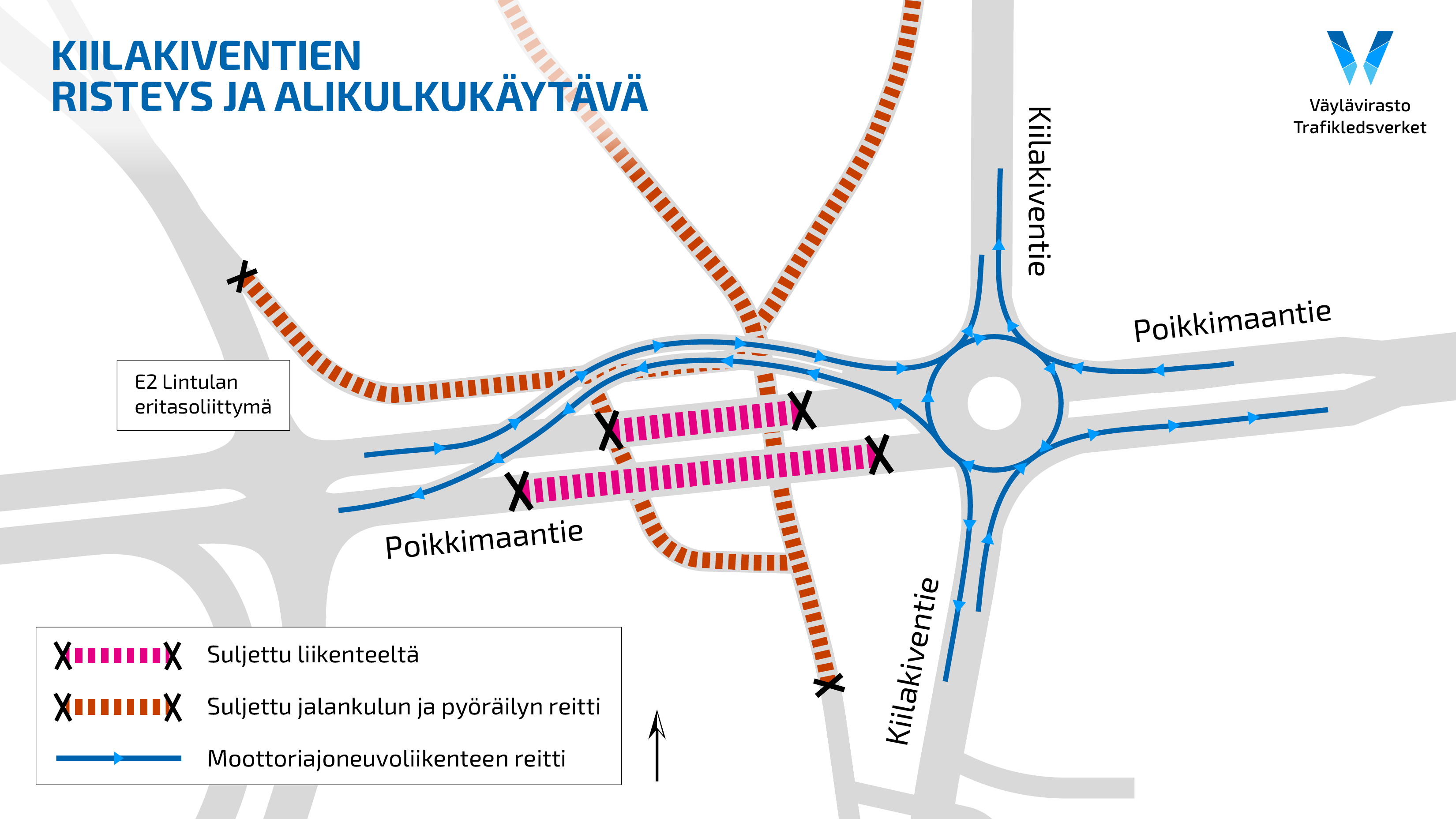Poikkimaantie suljetaan liikenteeltä Kiilakiventien ja Mäntylänpolun alikulkusiltojen kohdilta torstain 26. lokakuuta vastaisena yönä. Purkamisen ja rakentamisen ajaksi liikenne ohjataan lyhyille kiertoreiteille, jotka on merkitty selkeästi paikan päällä. Lisäksi Kiilakiventien risteykseen rakennetaan tilapäinen liikenneympyrä liikennettä sujuvoittamaan. Nykyisten siltojen alikulkukäytävät suljettiin pyöräilijöiltä ja jalankulkijoilta rakentamisen vuoksi jo lokakuun alkupuolella.