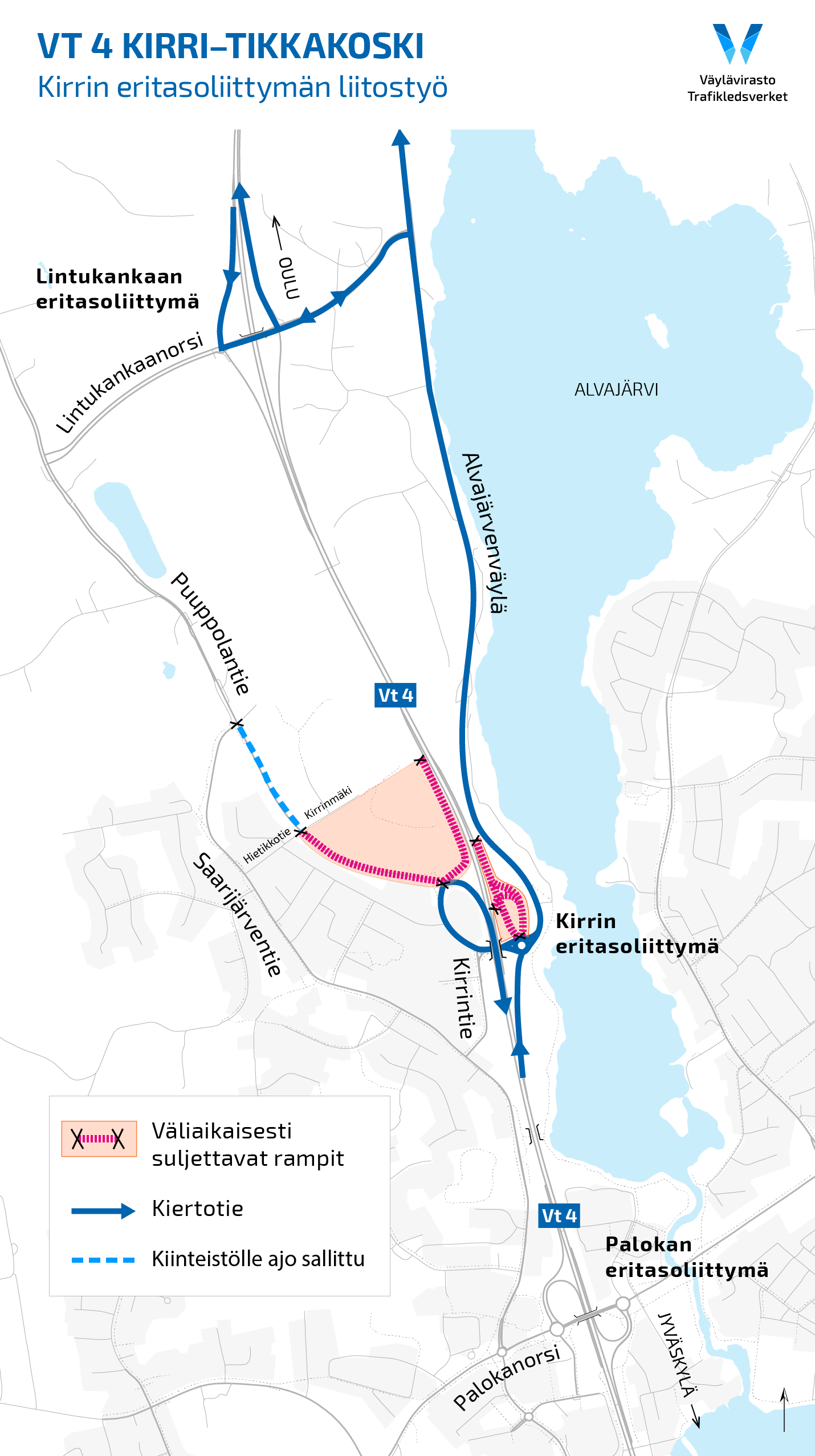 Opastettu kiertotie Kirriin kulkee Alvajärvenväylää pitkin, jonne liikenne ohjataan Lintukankaan eritasoliittymästä. Rampit otetaan käyttöön sitä mukaan, kun työt valmistuvat, kuitenkin viimeistään torstain 27. heinäkuuta aikana. Jyväskylän suunnasta Kirriin johtava uusi ramppi otetaan käyttöön 24. heinäkuuta.