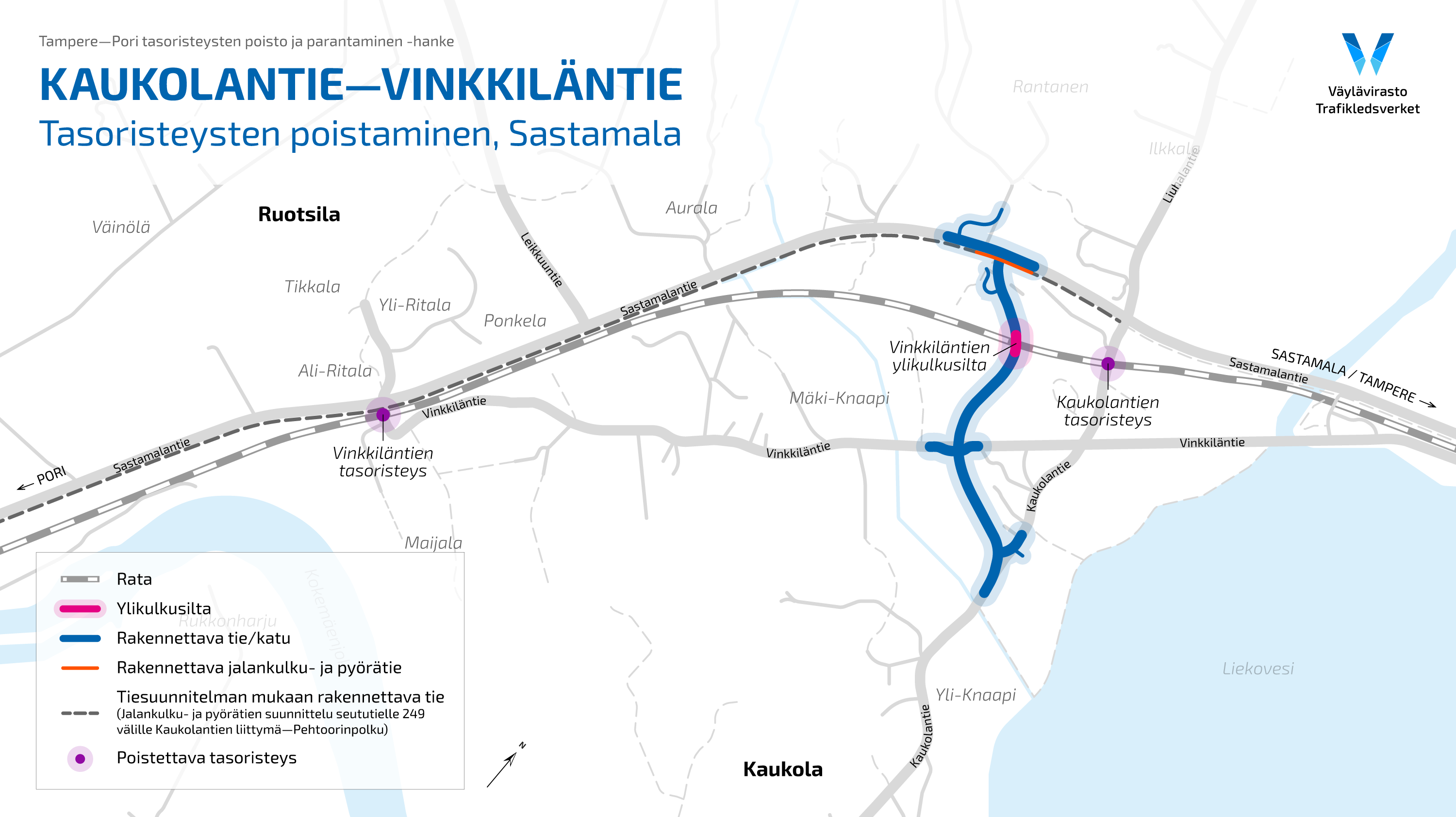 Osana Tampere–Pori tasoristeysten poisto ja parantaminen -hanketta poistetaan Sastamalassa kaksi tasoristeystä tiistaina 9.7.2024. Kaukolantien ja Vinkkiläntien tasoristeyksien poistumisen myötä kulkeminen alueella muuttuu. Tampere-Pori-rata ylitetään Kaukolantien tasoristeyksen länsipuolelle rakennetun uuden, Vinkkilän ylikulkusillan kautta.