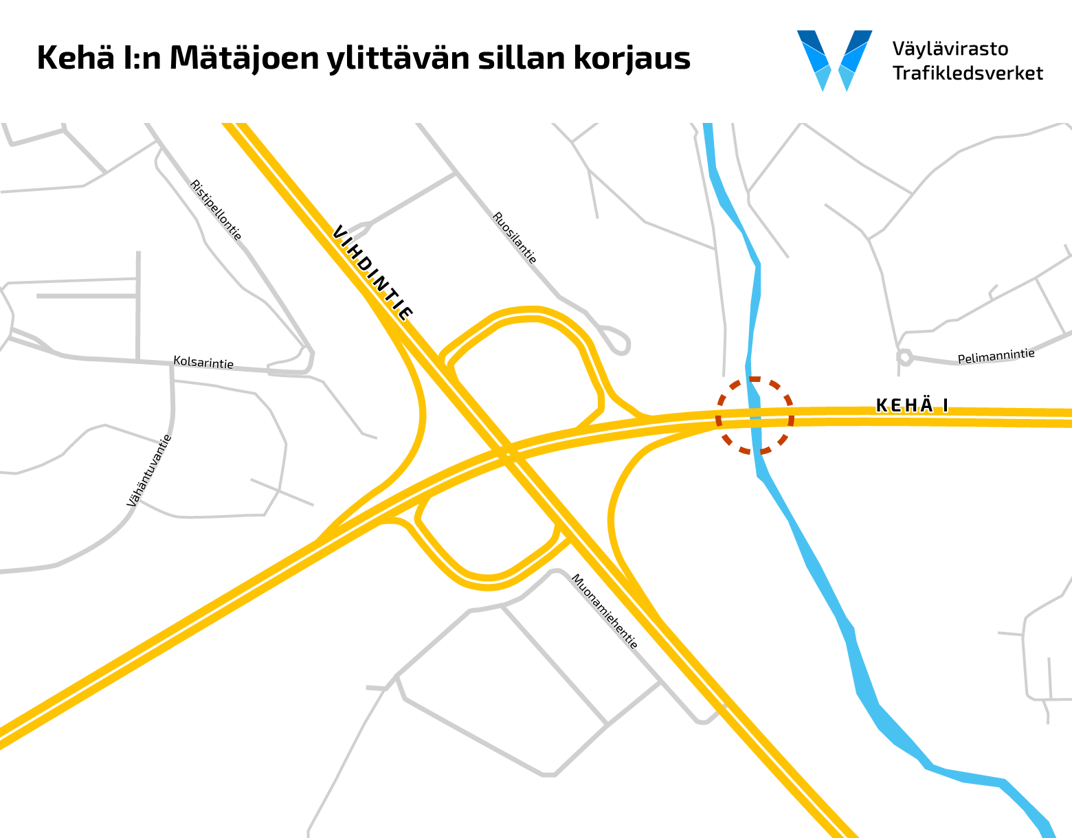 Kehä I:n (maantie 101) Mätäjoen ylittävän sillan pintarakenteiden korjaus aloitetaan maanantaina 3. toukokuuta. Korjaustöitä tehdään sillan pohjoispuolella eli lännen suunnan kaistoilla neljän viikon ajan.