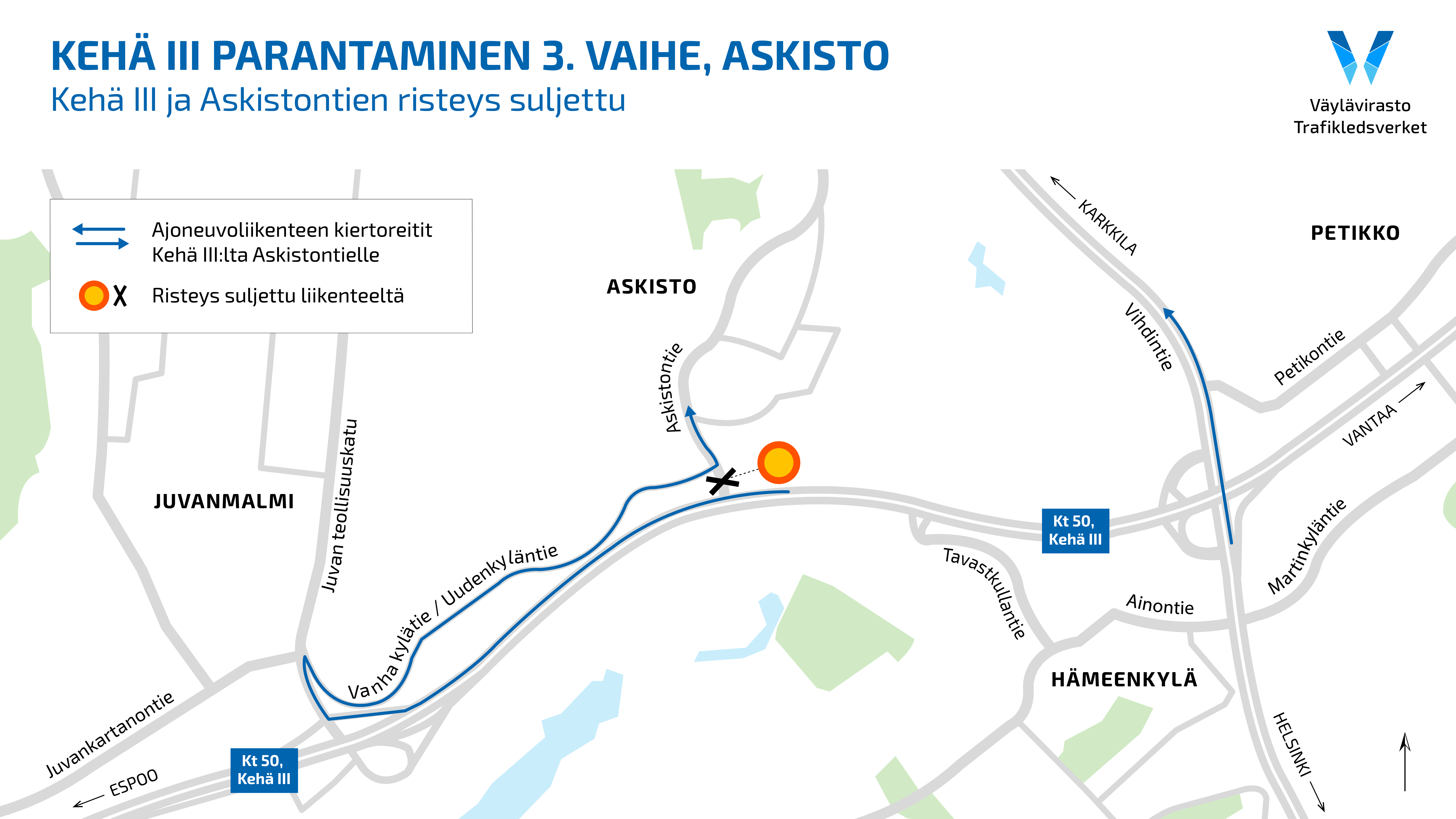 Kehä III:n ja Askistontien liittymä suljetaan liikenteeltä 21. kesäkuuta alkaen. Liittymä on poissa käytöstä syksyyn 2021 saakka. Kiertoreitit Askistoon kulkevat Vihdintien kautta sekä Juvanmalmin suunnasta reittiä Vanha kylätie–Uudenkyläntie–Askistontie.