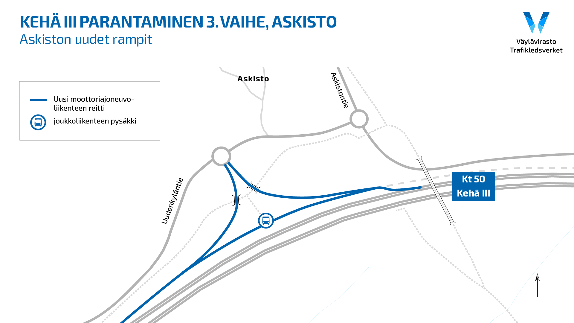 Kehä III:n parannustyöt etenevät ja kulkeminen Askiston ja Kehä III:n välillä sujuvoituu, kun torstaina 10.11. avataan kaksi uutta ramppia Uudenkyläntien ja Kehä III:n välille.