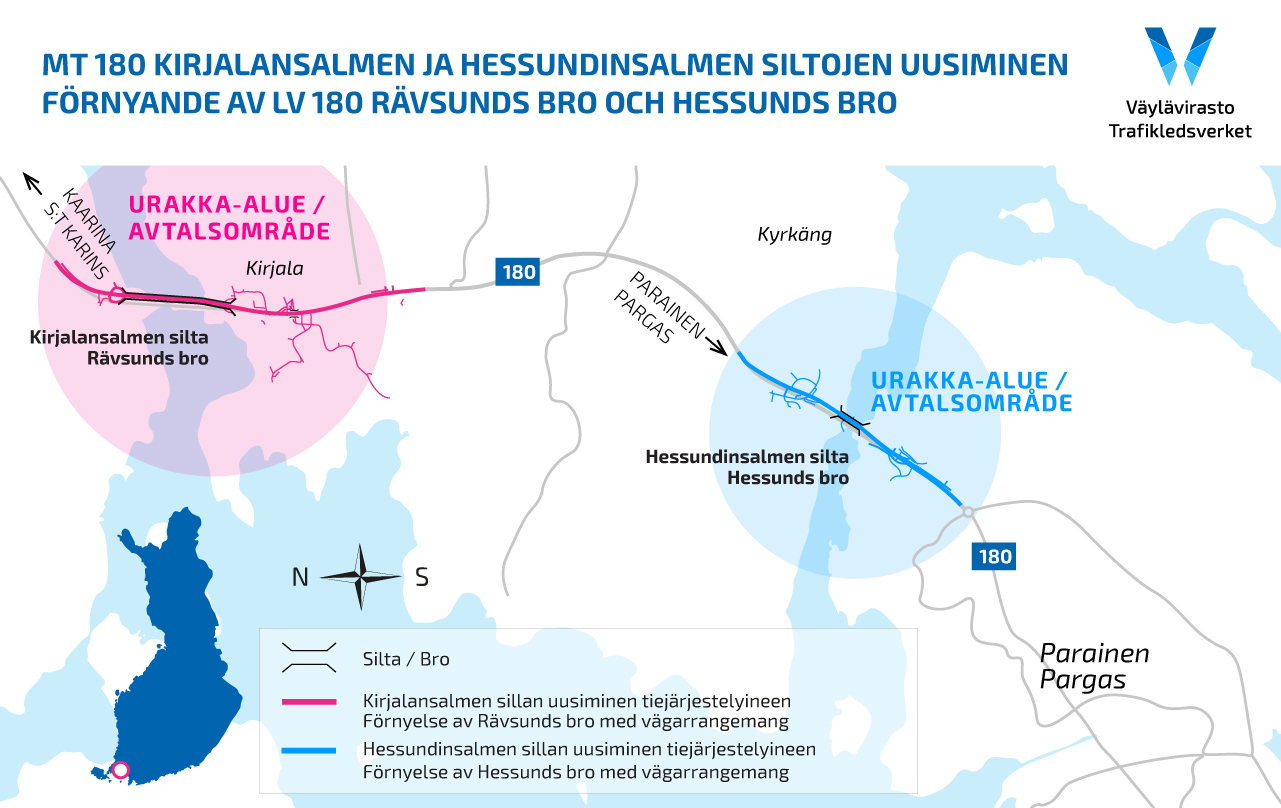 Mt 180 Kirjalansalmen ja Hessundinsalmen siltojen uusimishankkeen hankinnat on käynnistetty ja allianssimallilla toteutettavan hankkeen urakoitsijan valinta pyritään tekemään syys-lokakuun aikana. Hankkeen tavoitteena on turvata ainoan maantieyhteyden säilyminen entistä parempana Paraisille ja Turunmaan saaristoon. Hanke myös tukee Paraisten elinkeinoelämän ja maankäytön kehittämistä sekä lisää liikenteen turvallisuutta ja asumisviihtyisyyttä.