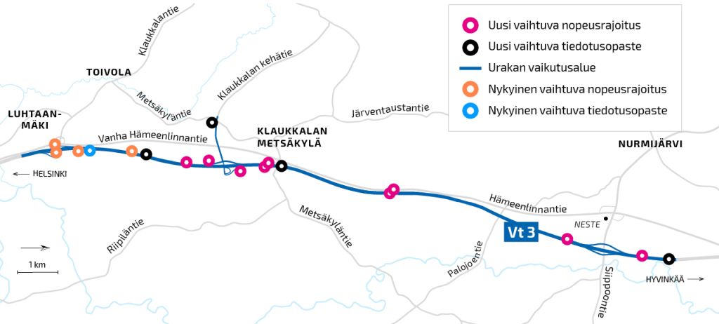 - 16 uutta vaihtuvaa nopeusrajoitusmerkkiä valtatielle 3