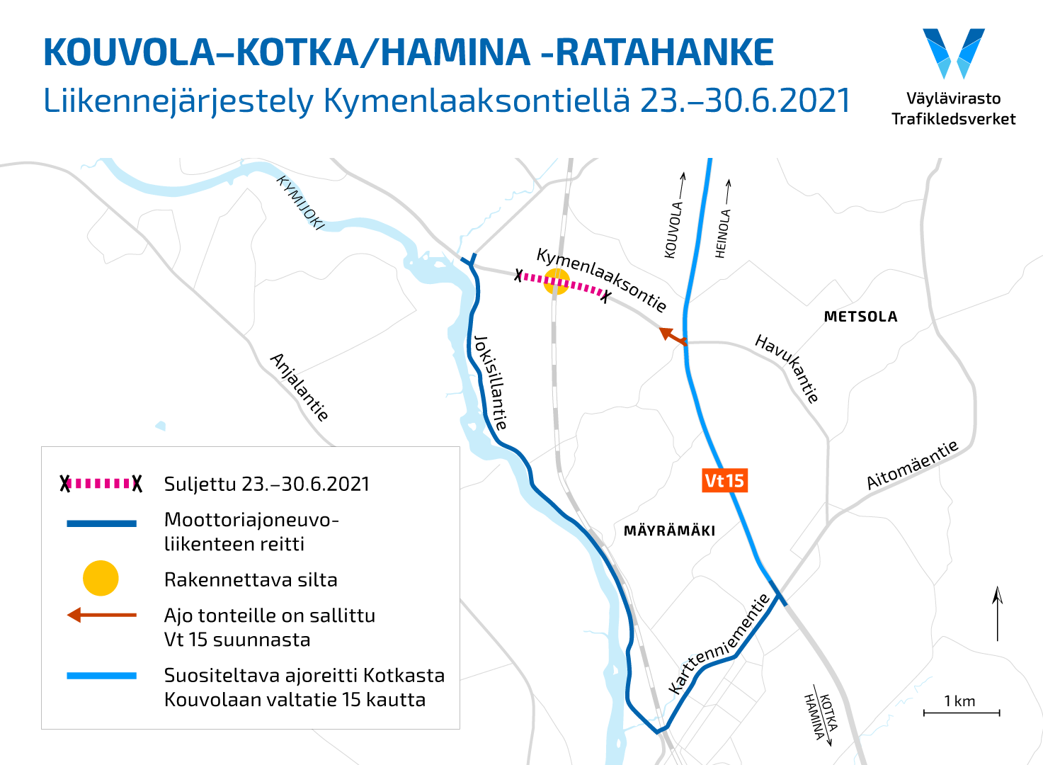 Kiehuvan alikulkusillan rakennustöiden vuoksi Kymenlaaksontie suljetaan liikenteeltä Jokisillantien ja Valtatie 15 välistä juhannuksena 23.–29.6. kestävän liikennekatkon aikana. Silloin nykyinen silta puretaan ja sillan viereen rakennettu uusi sillan kansi siirretään lopulliselle paikalleen. Kiertotiejärjestelyt on esitetty liitteenä olevassa kartassa.