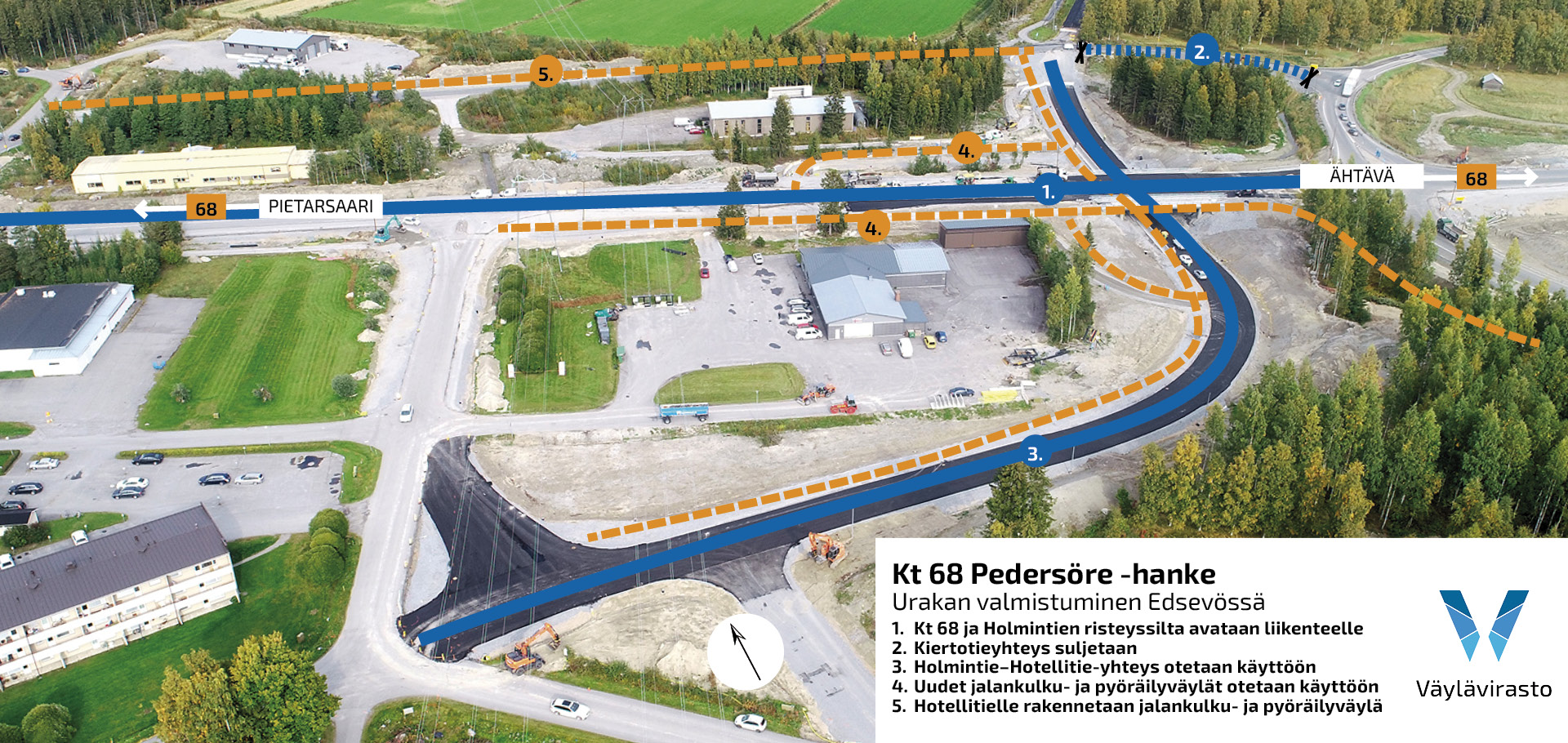 Viime vuoden syksyllä käynnistyneessä urakassa Pedersören Edsevössä parannettiin valtatien 8 ja kantatien 68 välistä eritasoliittymää ja jatkettiin Holmintietä Granholmintörmän risteyksestä Hotellitielle kantatien ali. Holmintien ja kantatien risteyskohtaan rakennettiin uusi risteyssilta. Lisäksi Edsevössä on rakennettu uusia jalankulun ja pyöräilyn väyliä sekä kunnostettu valtatien 8 alittava Joksholman kevyen liikenteen tunneli.