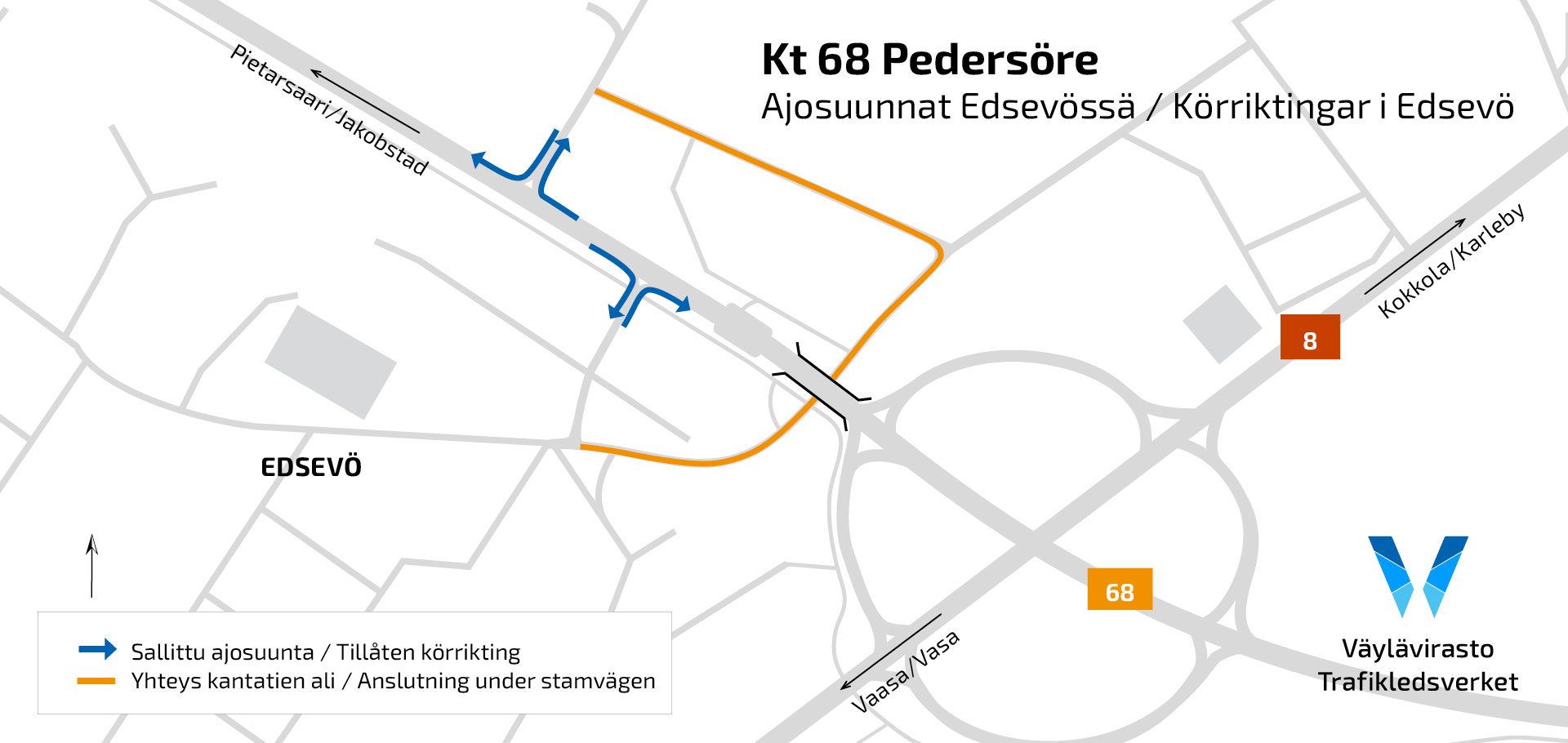 Kantatien 68 parannushanke Pedersöressä valmistuu. Liittymätöiden myötä risteysjärjestelyt muuttuvat Edsevössä. Muutokset tulevat voimaan torstaista 20. lokakuuta alkaen.