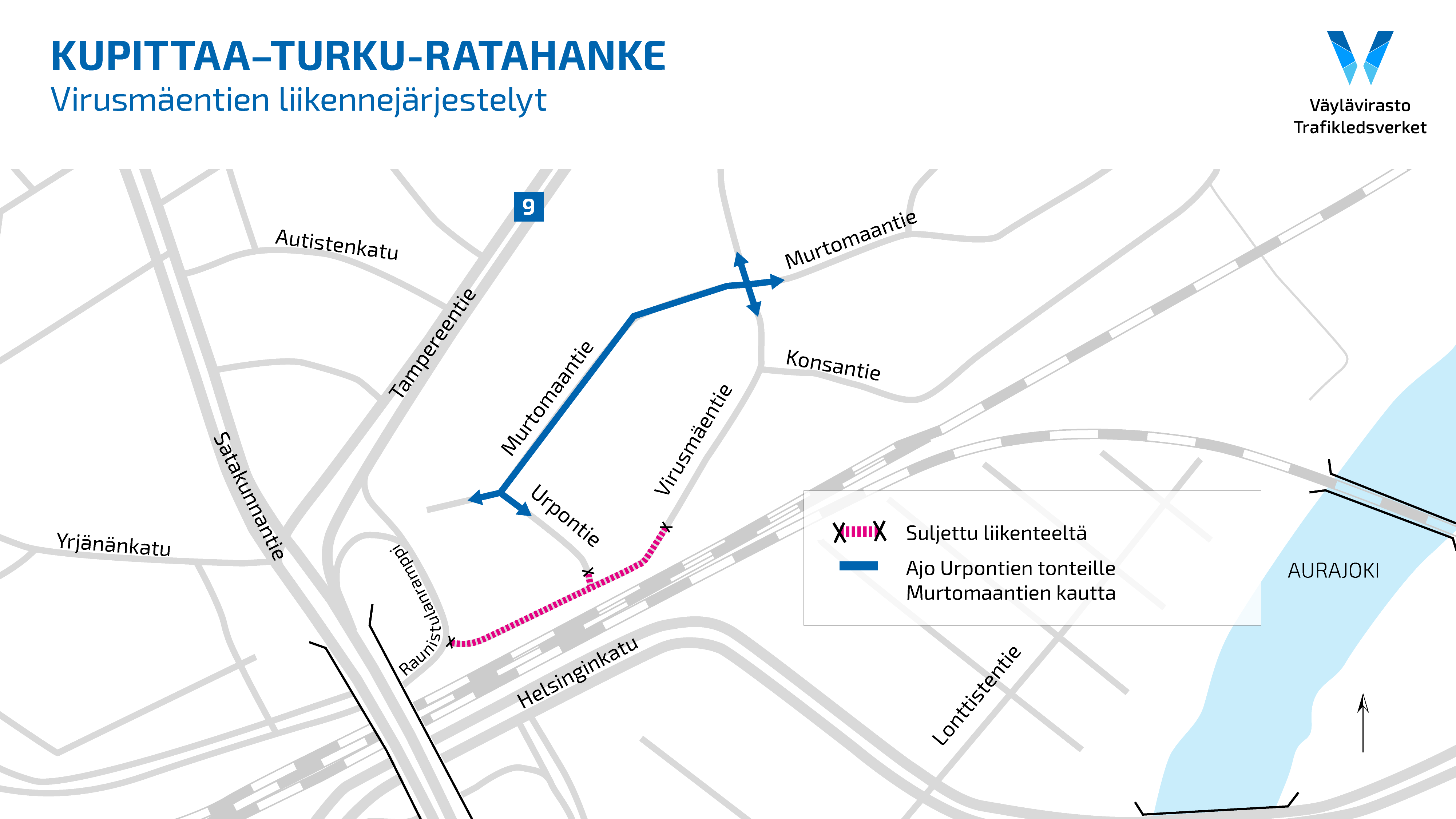 Virusmäentiellä rakennetaan muun muassa tukimuuria ja tehdään muita rakennustöitä elokuun loppuun saakka. Töiden aikana Virusmäentie on suljettu Raunistulanrampin ja Virusmäentie 4:n välisellä osuudella. Urpontien tonteille ajetaan sulun aikana Murtomaantien kautta.