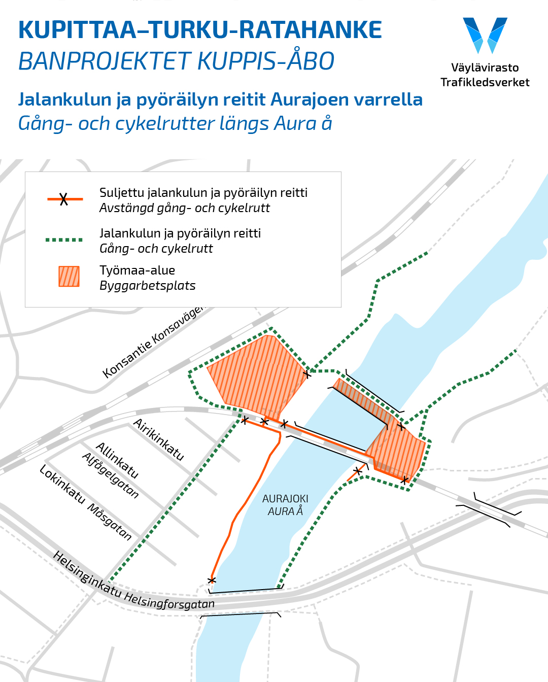 Kupittaa–Turku-ratahanke: Jalankulun ja pyöräilyn reitti siirtyy Aurajoen ratasillalta Raunistulan työsillalle