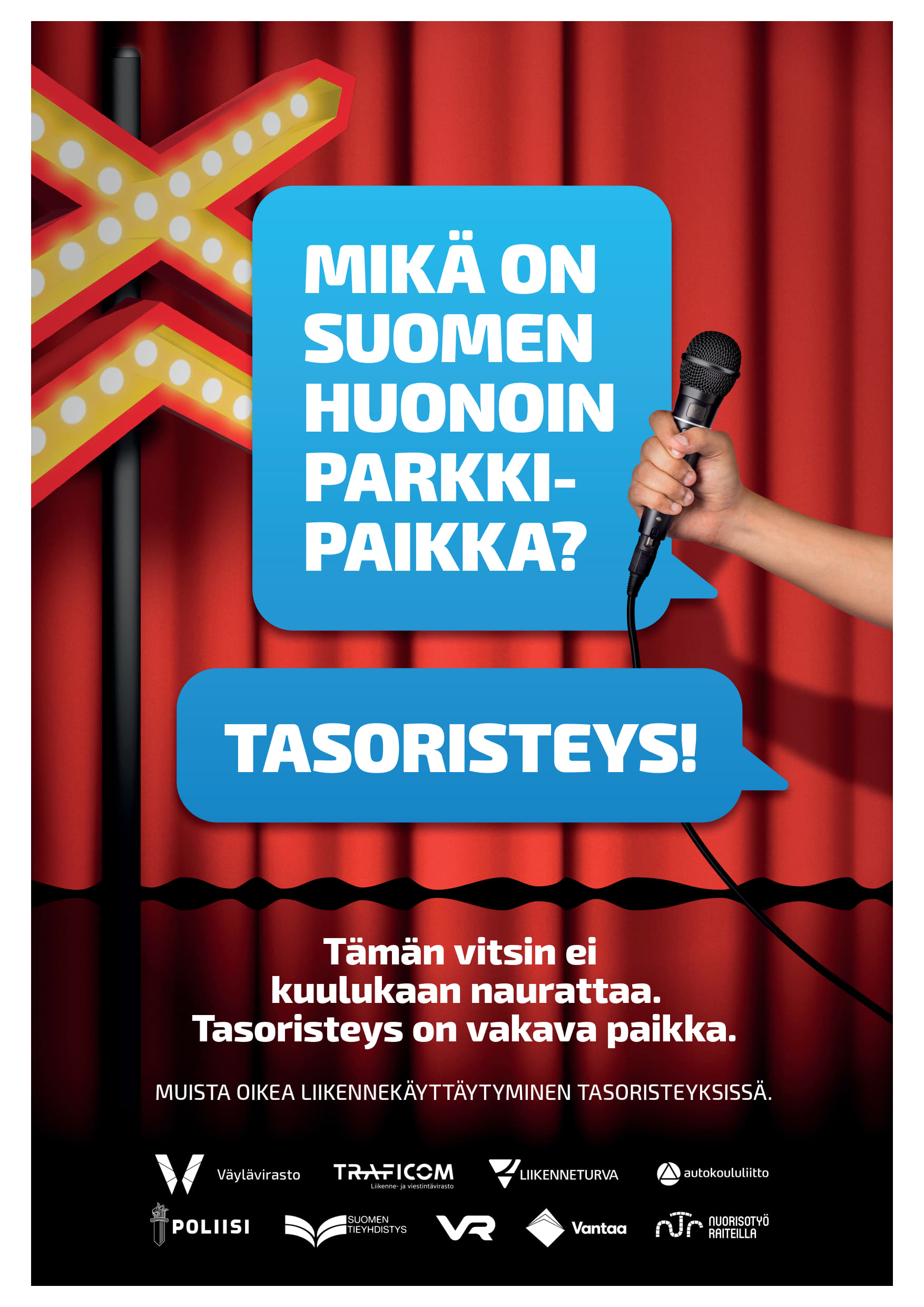 ”Juna ei voi väistää. Tasoristeysonnettomuus voi sattua kenelle tahansa tiellä liikkuvalle: pyöräilijälle, autoilijalle, mopoilijalle tai jalankulkijalle. Tasoristeyksessä on toimittava kuten liikenteessä muutenkin: ennakoi ja pohdi, ehditkö ja mahdutko turvallisesti yli. Jos juna on jo tulossa tai puomit laskeutumassa, on aivan liian myöhäistä lähteä ylitykseen”, muistuttaa turvallisuusasiantuntija Kaisa-Elina Porras Väylävirastosta.