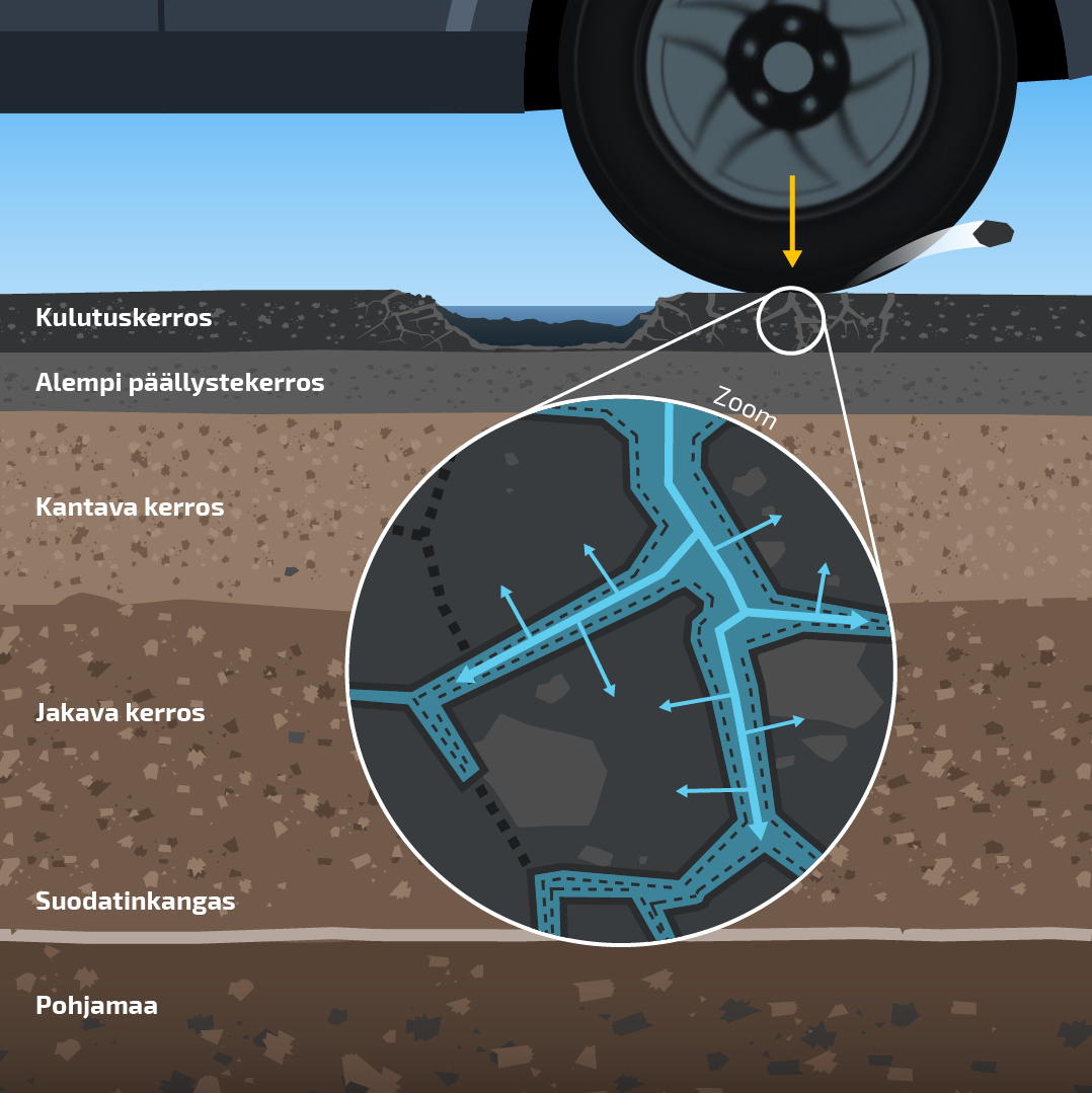 ”Runsaat sateet voivat vaurioittaa nopeasti päällysteitä ja tierakenteita, vaikka olemme tietoisesti panostaneet maanteiden kuivatukseen. Esimerkiksi paikkauksia pystytään korjaamaan pysyvästi vasta, kun tiet ovat täysin kuivia”, kertoo maanteiden hoidon johtava asiantuntija Otto Kärki Väylävirastosta.