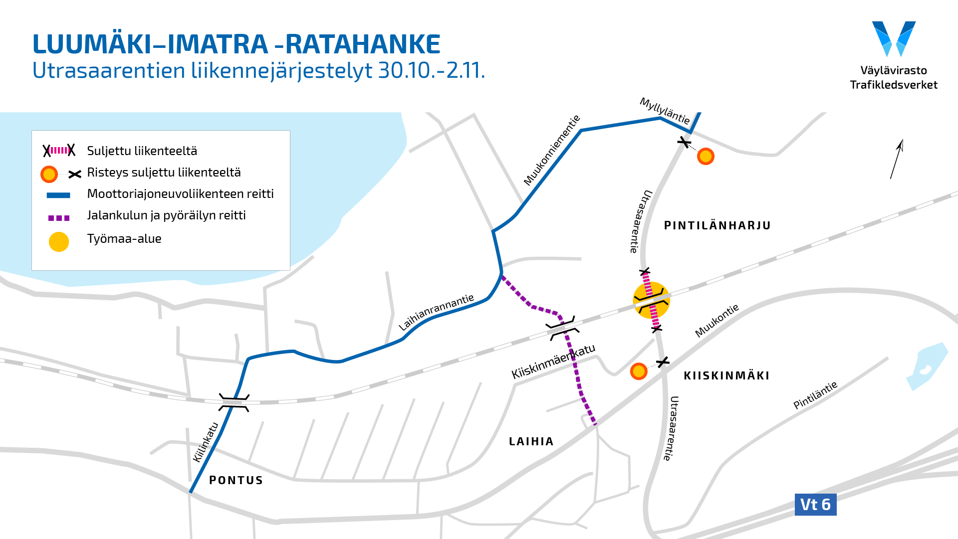 "Utrasaarentie suljetaan siltatyömaan kohdalta varsinaista rataliikennekatkoa pidemmäksi ajaksi, sillä muun muassa puramme vanhan sillan rakenteita alittavaa väylää hyödyntäen, kun uusi silta on tunkattu paikoilleen", kertoo Luumäki–Imatra-ratahankkeen projektipäällikkö Aki Hämäläinen Väylävirastosta.