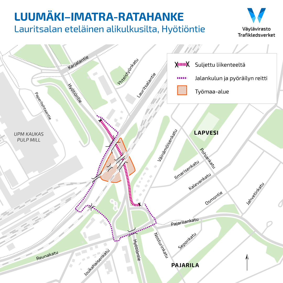 "Jotta Hyötiöntie saadaan mahdollisimman pian taas ajoneuvoliikenteen käyttöön, tekee työmaa töitä ympäri vuorokauden. Töistä tulee aiheutumaan melua lähialueelle", sanoo Luumäki-Imatra-ratahankkeesta vastaava projektipäällikkö Joonas Hämäläinen Väylävirastosta.