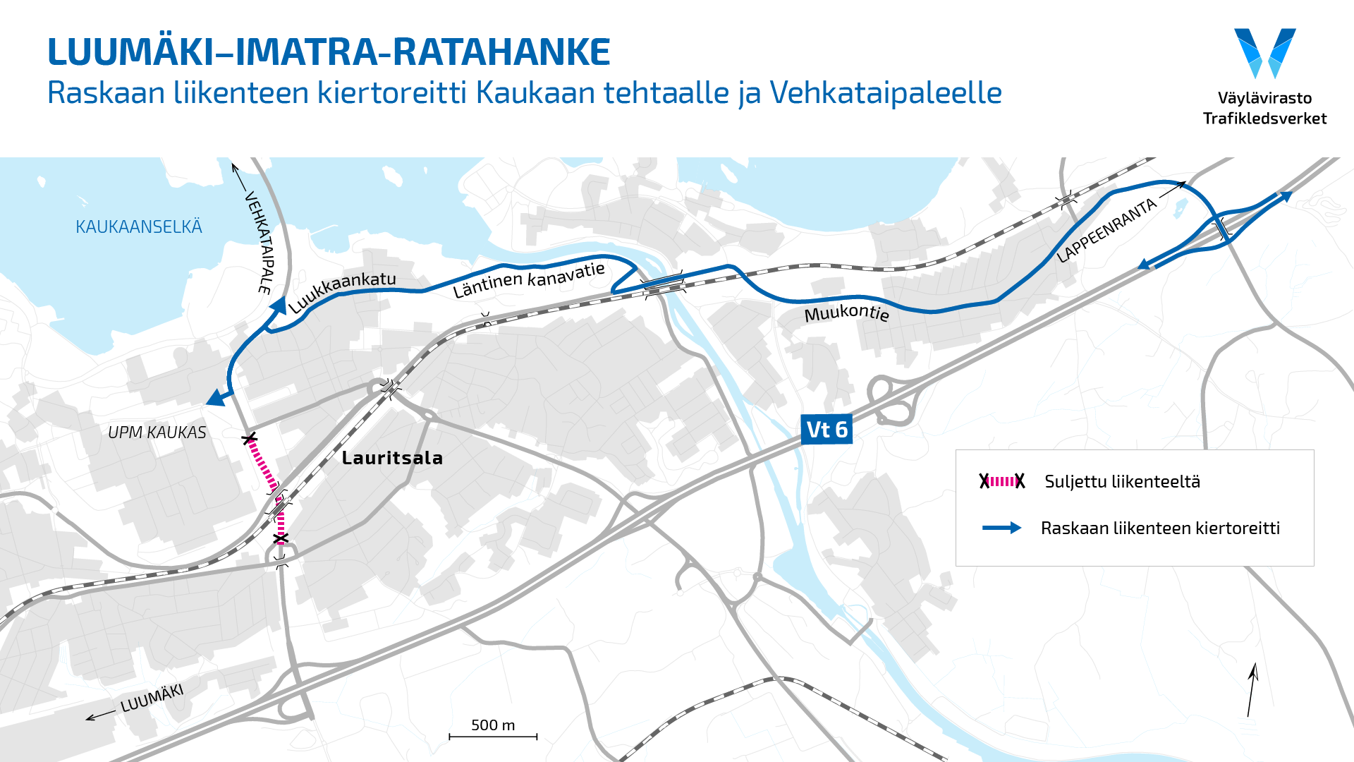 Kaukaan tehtaan liikenne ohjataan 23.6.-30.6.2022 Muukon eritasoliittymän (56) kautta Muukontielle, josta se ohjataan Läntisen kanavatien kautta tehtaalle. Kiertoreitti on esitetty tiedotteen liitteenä olevassa kartassa.