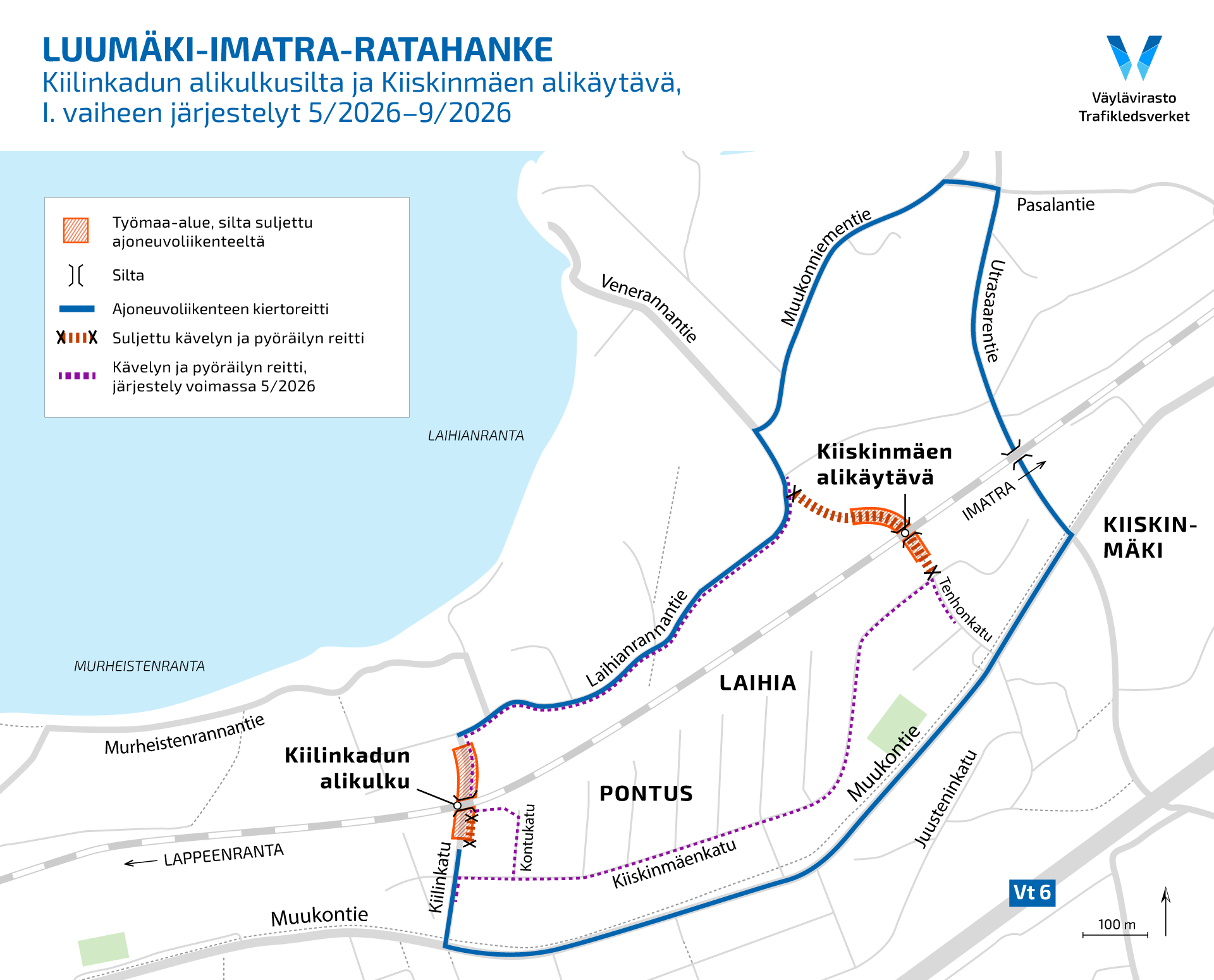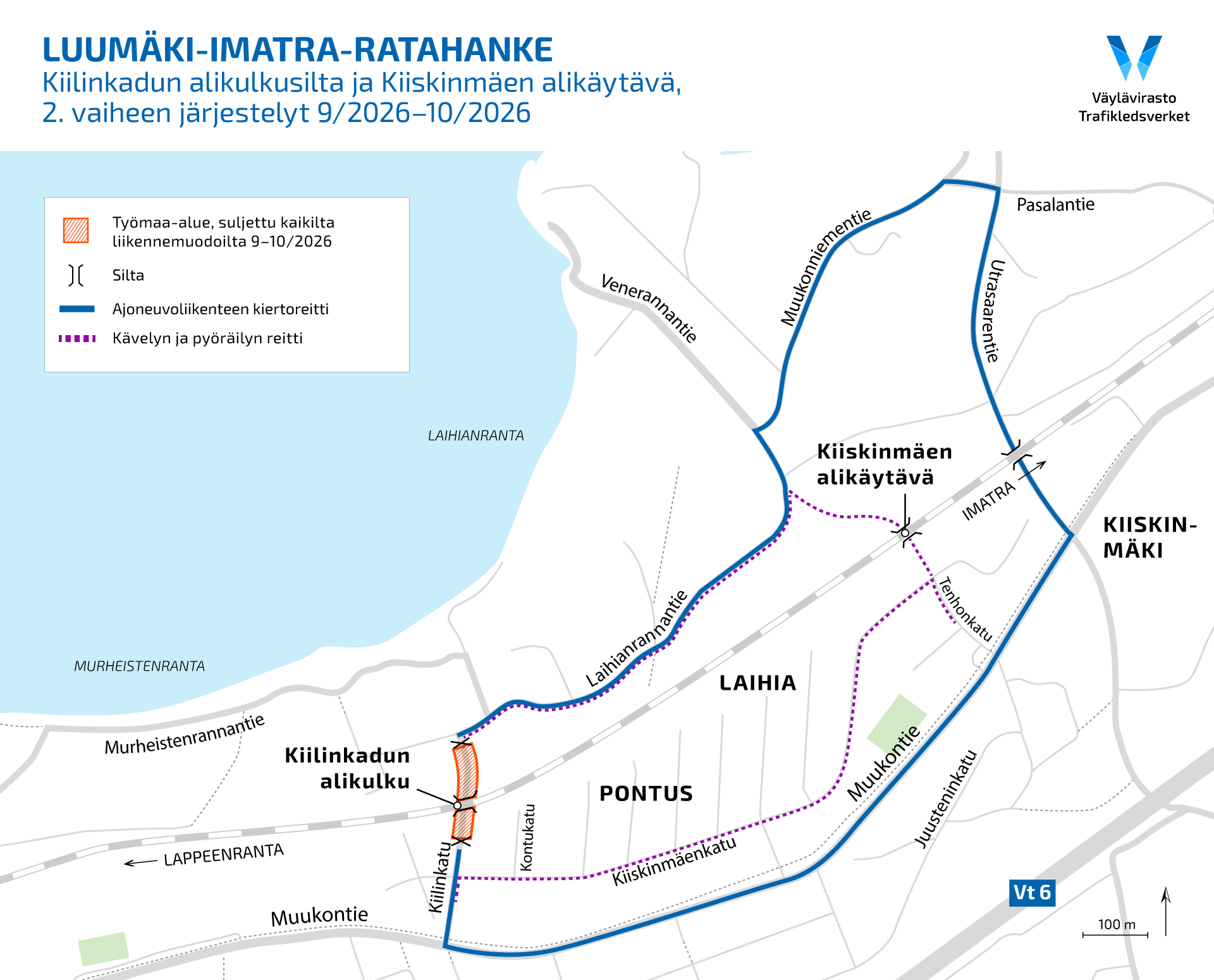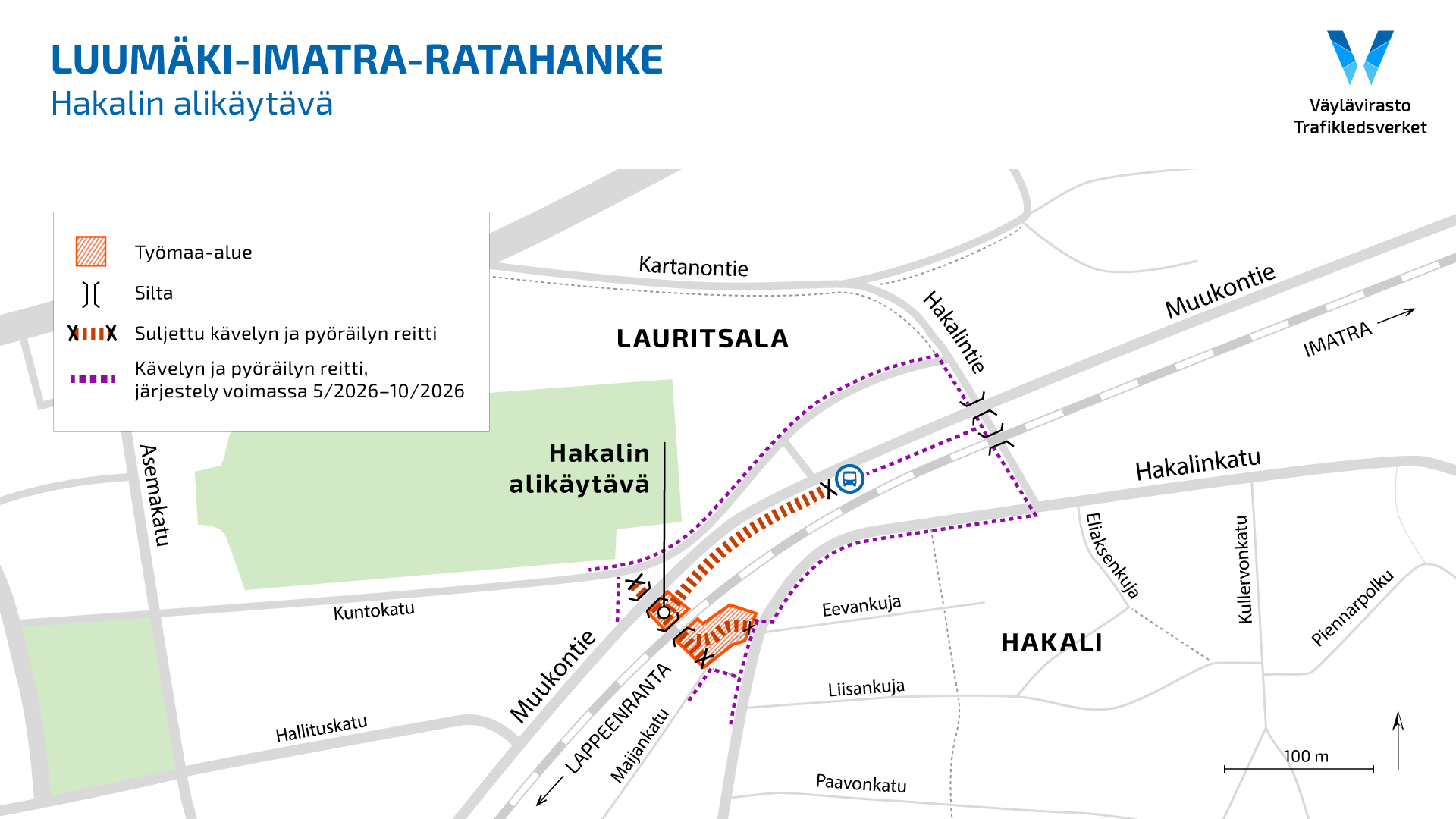 Hakalin alikäytävä on kokonaan suljettuna toukokuusta lokakuuhun 2026. Sillan läheisyydessä oleva Muukontien bussipysäkki on käytössä rakentamisen ajan, mutta kulkureitti sille muuttuu. Reitti on esitetty tiedotteen liitteenä olevassa kartassa.