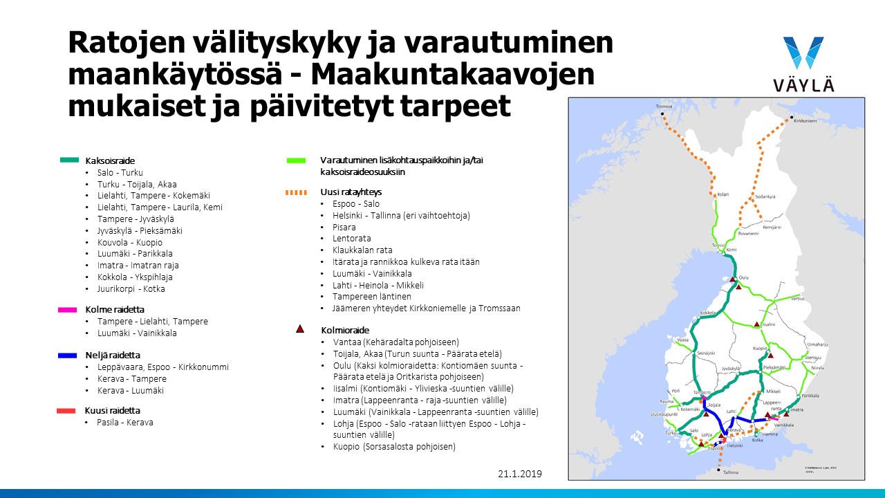Jotta junaliikenteen määrän lisääminen on mahdollista ja rautateiden kehittämismahdollisuudet turvataan, on maakuntakaavoissa, yleiskaavoissa ja asemakaavoissa varauduttava jo hyvissä ajoin kehittämismahdollisuuksiin ja tilatarpeisiin. Mikäli kehittämiseen ei varauduta, voi tarvittavien ratahankkeiden toteuttaminen osoittautua myöhemmin hyvin vaikeaksi, merkittävän kalliiksi tai jopa mahdottomaksi. Katse päivityksessä on pitkällä tulevaisuudessa vuosikymmenien päässä, eikä tässä yhteydessä ole ajoitettu tai priorisoitu tarpeita.
