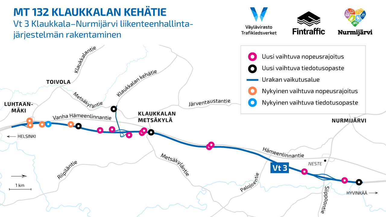 Osana Klaukkalan ohikulkutie -hanketta toteutettu liikenteenhallintajärjestelmän laajennus valtatielle 3 on valmistunut, ja se otetaan käyttöön 2. marraskuuta. Järjestelmä ulottuu Klaukkalan eritasoliittymästä Nurmijärven kirkonkylän liittymään ja osittain myös Klaukkalan kehätielle. Uutta järjestelmää on rakennettu noin yhdeksän kilometrin matkalle.