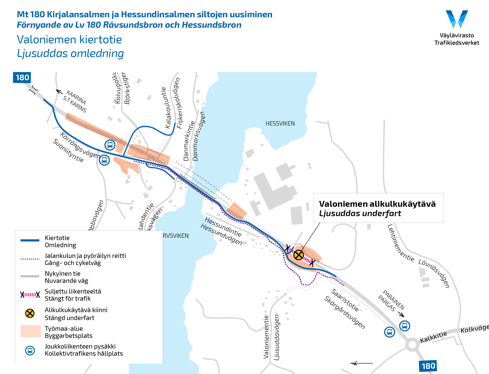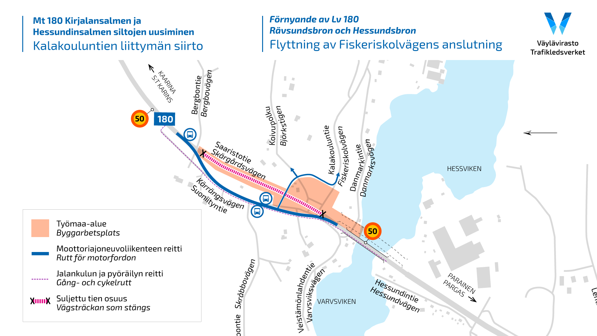 Mt 180 Kirjalansalmen ja Hessundinsalmen siltojen uusiminen -hanke: liikennejärjestelyitä Hessundinsalmen sillan hankealueella lokakuusta 2023 lähtien