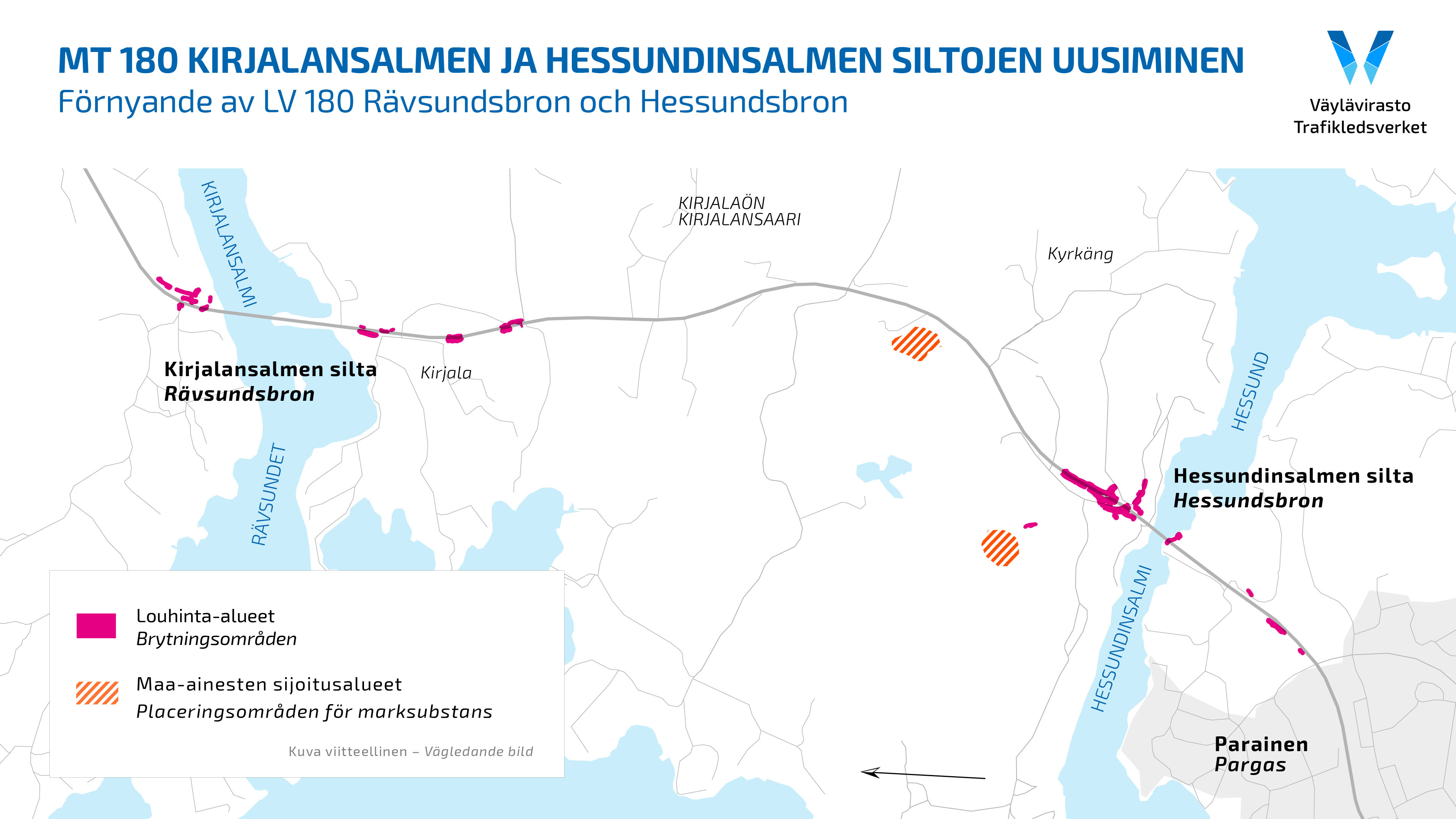 Mt 180 Kirjalansalmen ja Hessundinsalmen siltojen uusiminen -hanke: louhintoja tehdään pitkin vuotta molempien hankealueiden osalta
