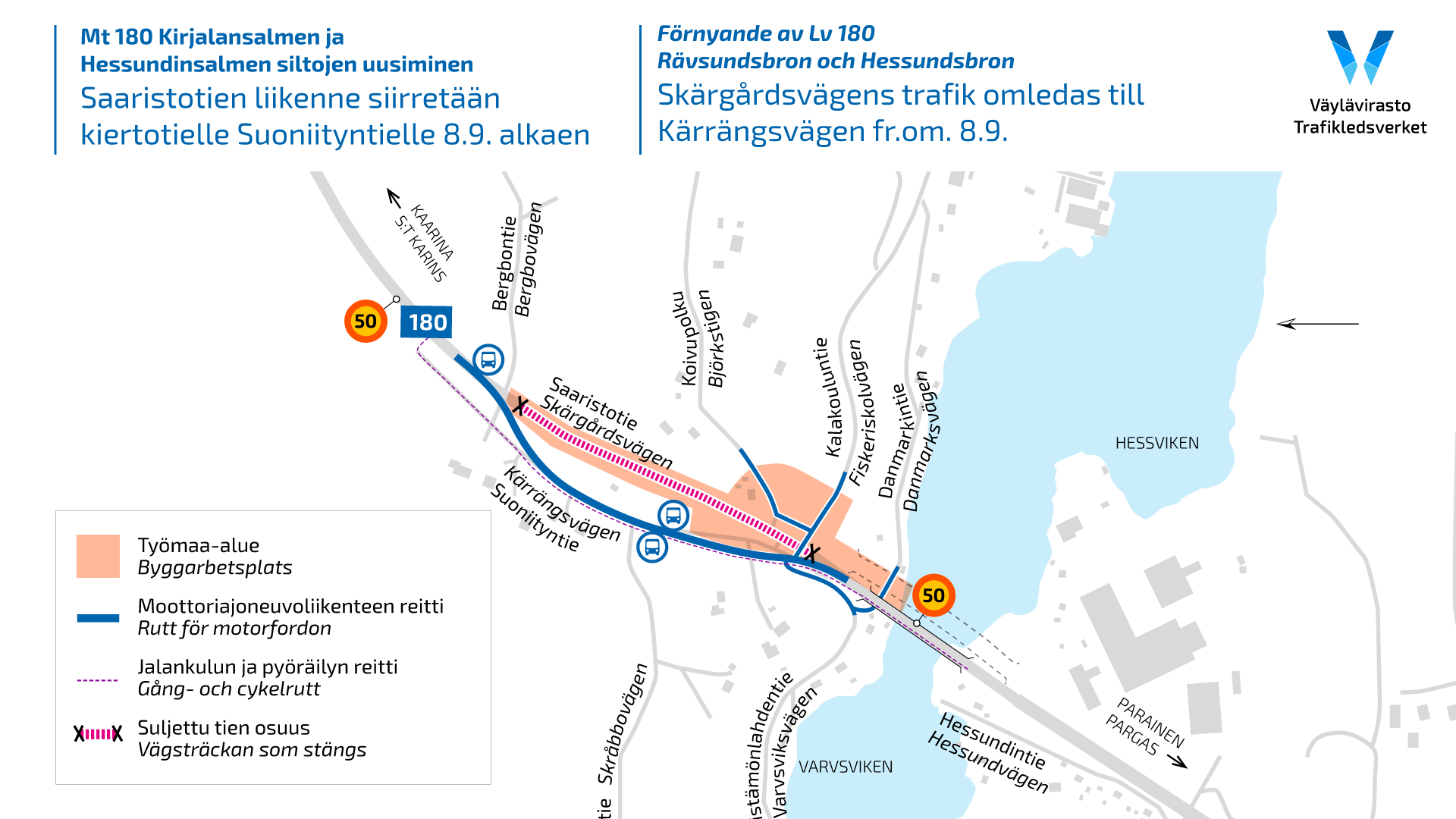 Mt 180 Kirjalansalmen ja Hessundinsalmen siltojen uusiminen -hanke: Saaristotien liikenne siirretään kiertotielle Kalakouluntien ja Bergbontien liittymien välisellä alueella