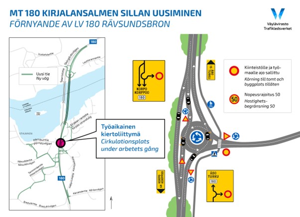 Mt 180 Kirjalansalmen ja Hessundinsalmen siltojen uusiminen -hankkeessa Saaristotiellä tulee käyttöön työnaikainen kiertoliittymä ajoneuvoliikenteelle viikosta 19 alkaen. Kiertoliittymä on käytössä toistaiseksi ja se sijaitsee noin 500 metriä Kirjalansalmen sillasta etelään (ks. kartta).