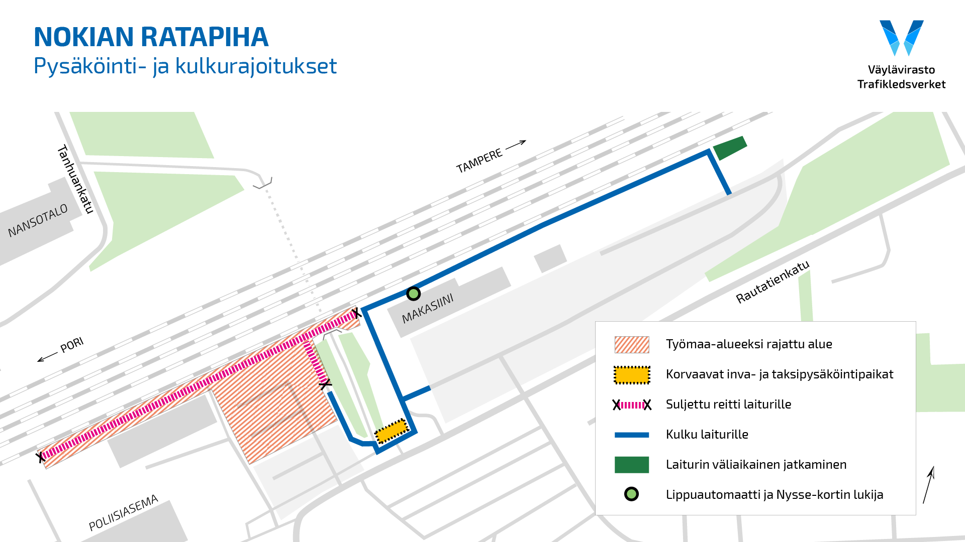 Uuden alikulkukäytävän töiden sujuvan etenemisen varmistamiseksi Nokian asemalla nykyistä reunalaituria puretaan Porin puoleisessa päädyssä ja jatketaan väliaikaisesti Tampereen puoleisestä päädystä. Reunalaiturin purun yhteydessä siirtyvät lippuautomaatit Tampereen suuntaan.