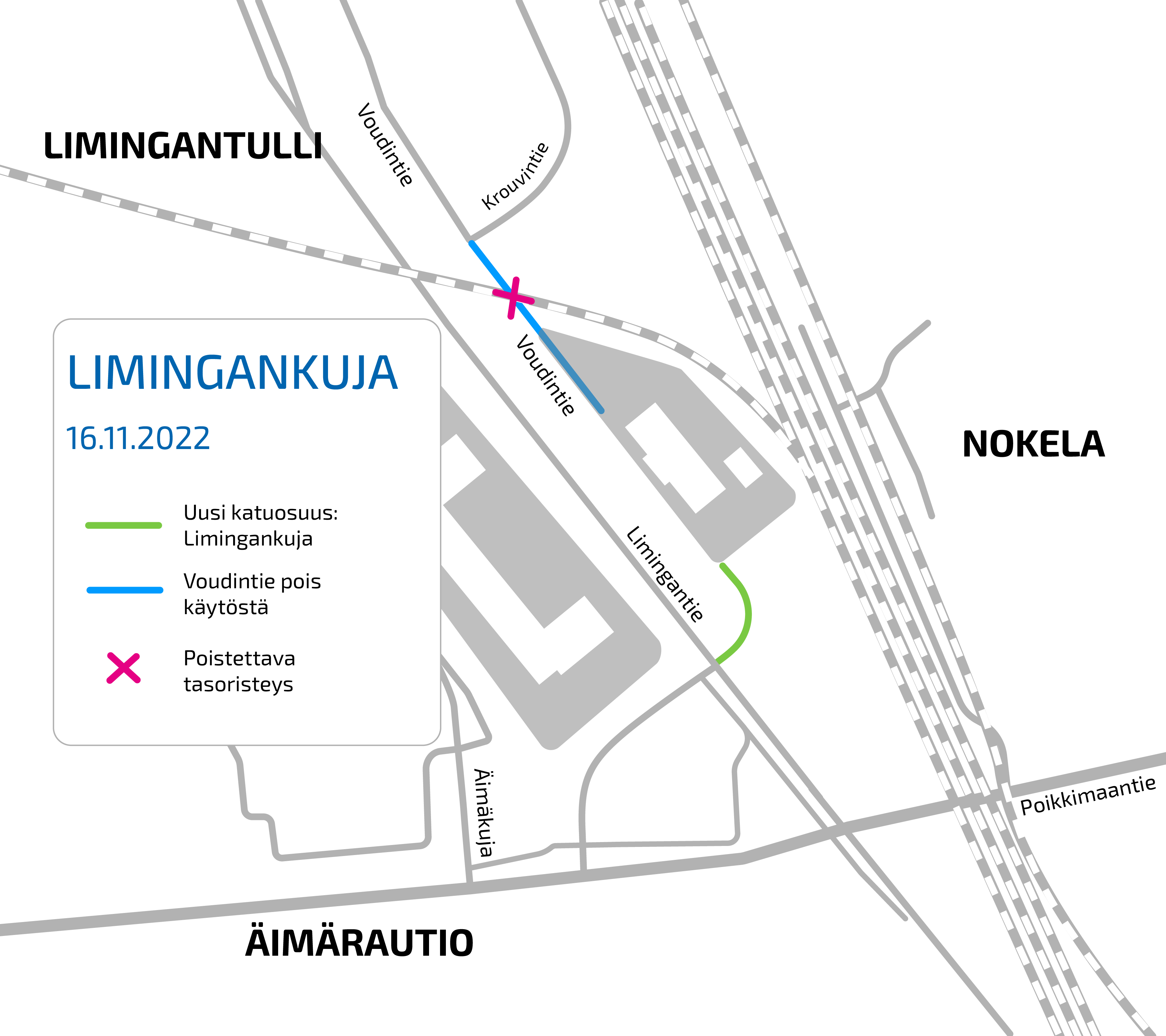 Limingankujan käyttöönotto vaikuttaa myös lähialueen tie- ja liikennejärjestelyihin, sillä tiistaina Voudintie suljetaan pysyvästi Krouvintien risteyksen jälkeiseltä osuudelta. Samalla poistetaan käytöstä vanha Voudintien tasoristeys.