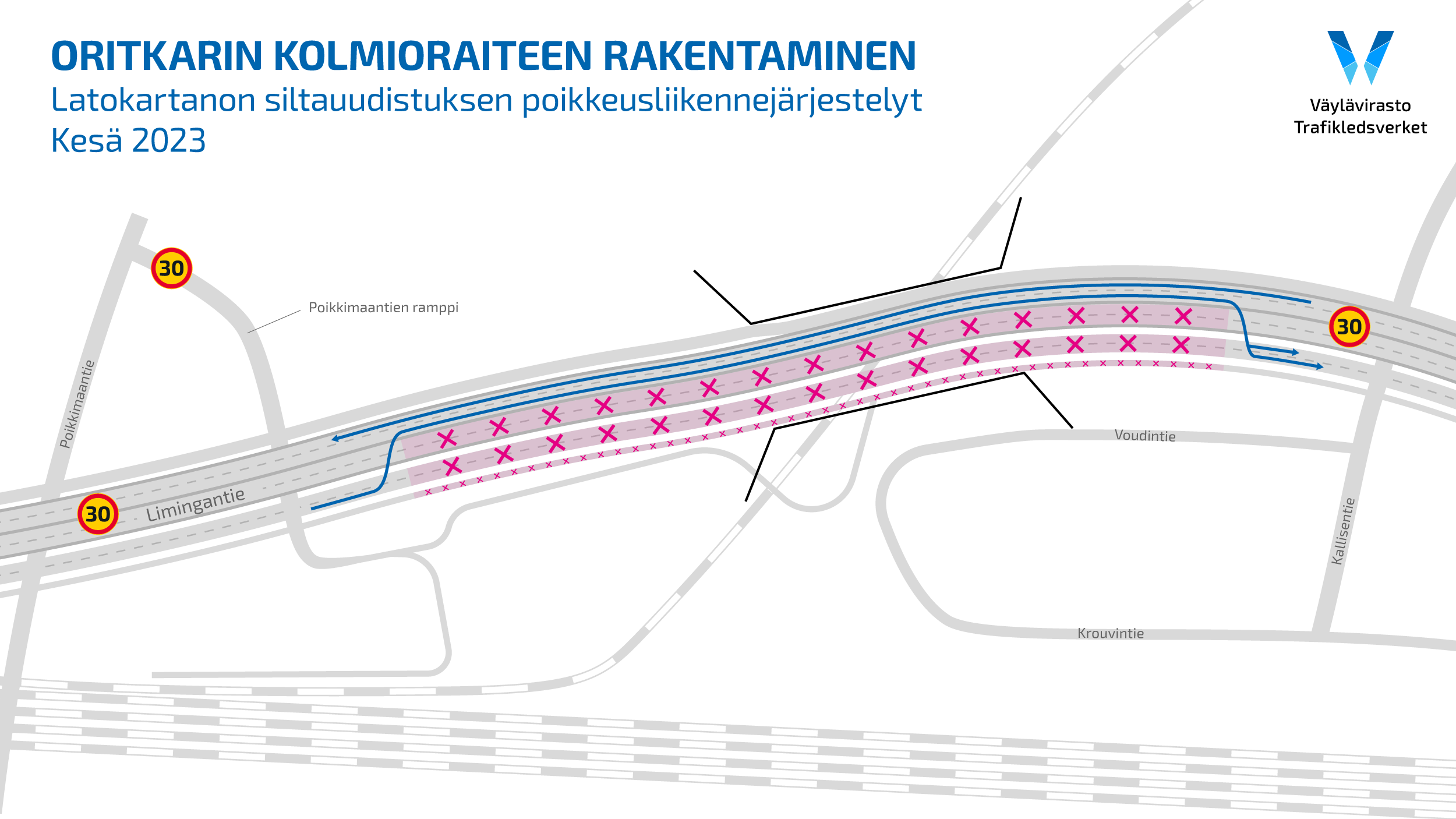 Poikkeusliikennejärjestelyt ovat voimassa siihen asti, kunnes rakennus- ja purkutyöt valmistuvat. Alueen nopeusrajoitus on 30 kilometriä tunnissa.