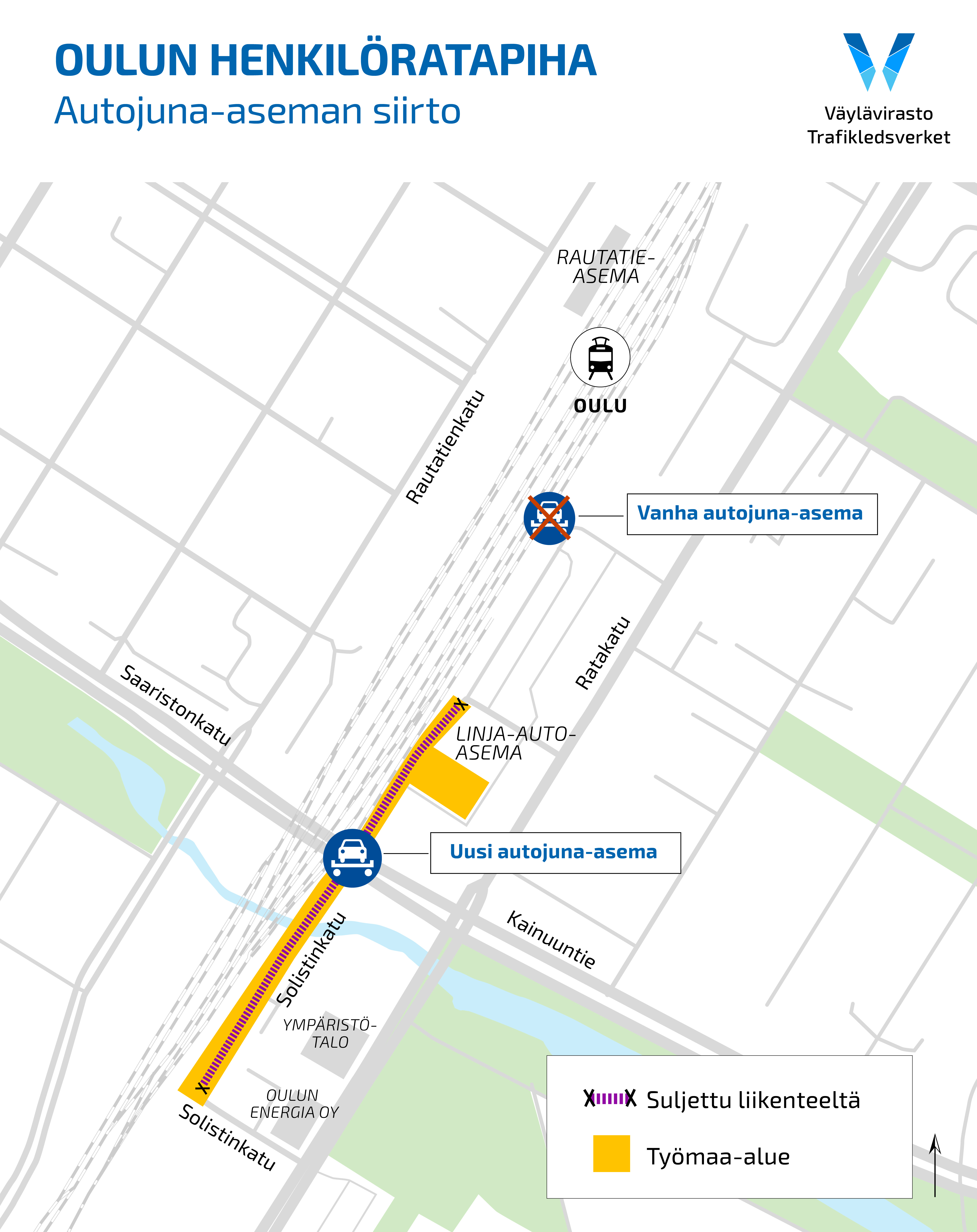 Oulun rautatieaseman henkilöratapihan parannusurakka alkaa 7. huhtikuuta 2026. Työt alkavat autojuna-aseman siirrolla, minkä vuoksi osa Solistinkadusta suljetaan liikenteeltä huhtikuun aikana. Koko hankkeen on tarkoitus valmistua joulukuussa 2029. Väyläviraston ja Oulun kaupungin yhteinen hanke on osa Oulun asemanseudun laajaa kehitystyötä.