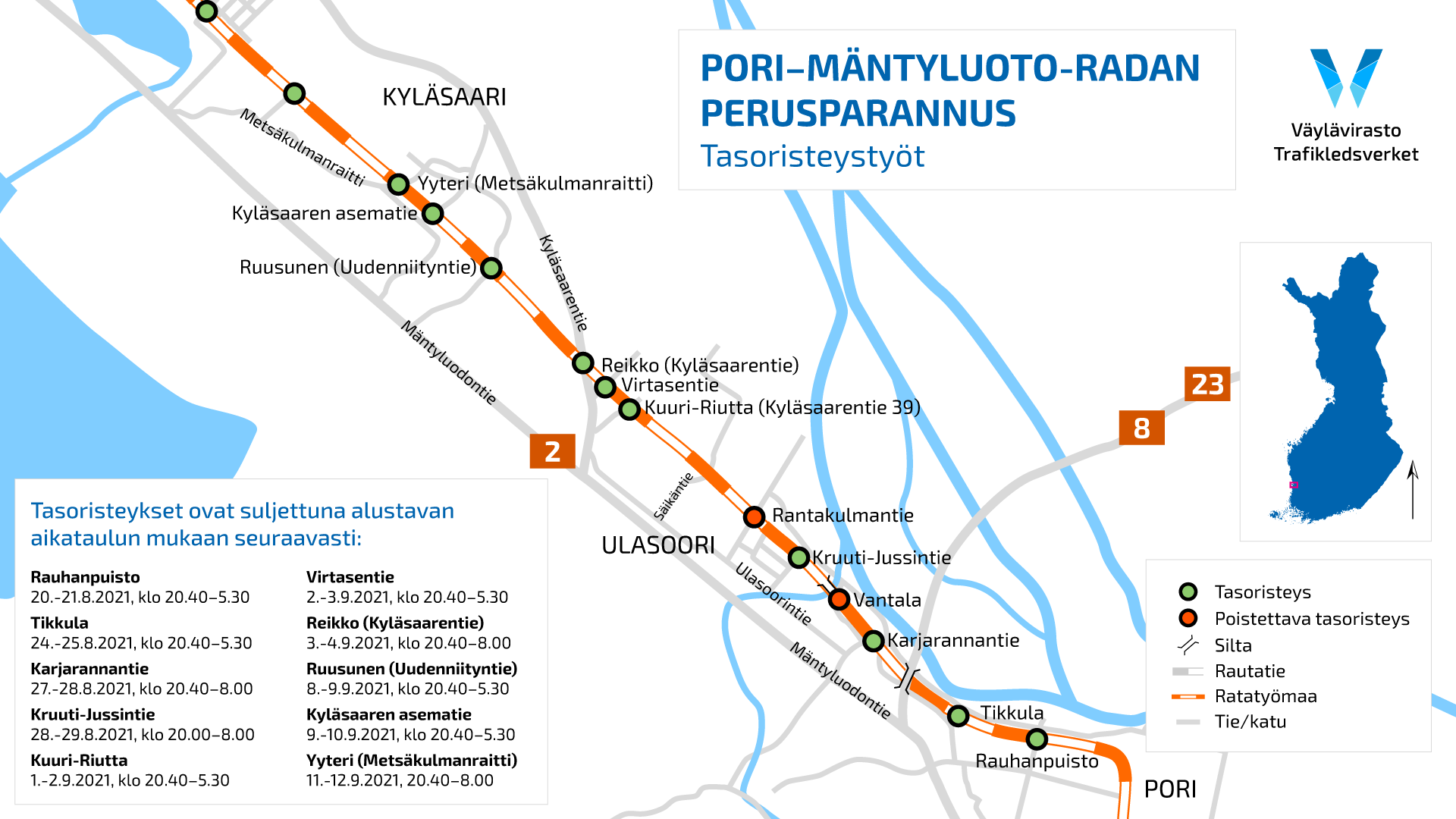 Lopuista Pori–Mäntyluoto-ratavälin tasoristeysten suluista tiedotetaan myöhemmin urakan edetessä.