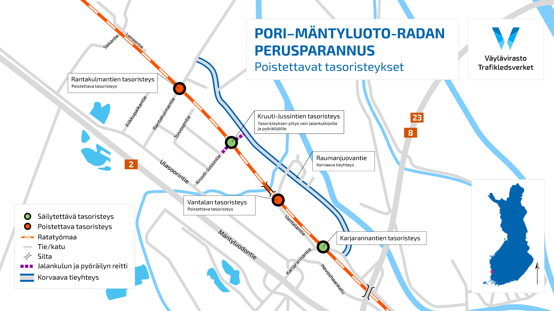 Porin ja Mäntyluodon välillä on yhteensä 22 tasoristeystä 16 kilometrin matkalla. Tasoristeyksiä perusparannetaan syksyn aikana. Osana perusparannushanketta Porista poistetaan Vantalan ja Rantakulmantien tasoristeykset. Tasoristeysten poistamisella parannetaan liikenneturvallisuutta.