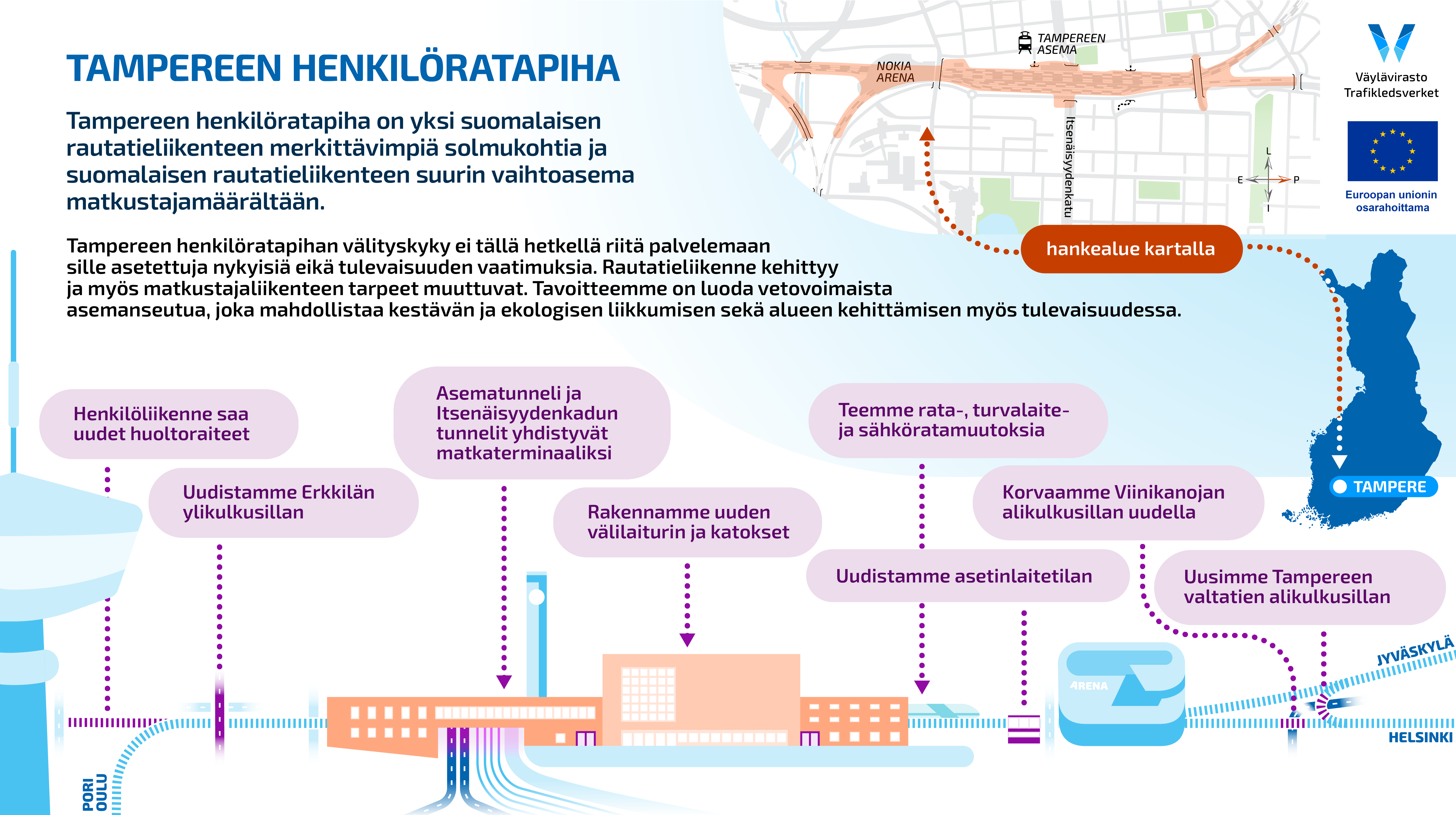 Tampereen henkilöratapiha sijaitsee kaupungin ytimessä eri liikennemuotojen solmukohdassa. Luomme asemanseutua, jossa liikkuminen on esteetöntä, sujuvaa ja turvallista. Varmistamme osaltamme valtakunnallisesti sujuvat matkat sekä toimivat kuljetukset. Parannamme Tampereen henkilöratapihan toimivuutta ja käyttäjäystävällisyyttä. Uuden matkaterminaalin myötä siirtyminen eri liikennemuotojen välillä helpottuu, ja uudet katokset, välilaiturit ja hissit tekevät matkanteosta aiempaa miellyttävämpää. Uusimme hankkeessa myös useita elinkaarensa päässä olevia siltakohteita sekä siirrämme henkilöjunien huollon pois henkilöratapihalta tehden tilaa matkustajajunille. Hankkeen suunnitteluvaihe on saanut tukea Euroopan unionilta.