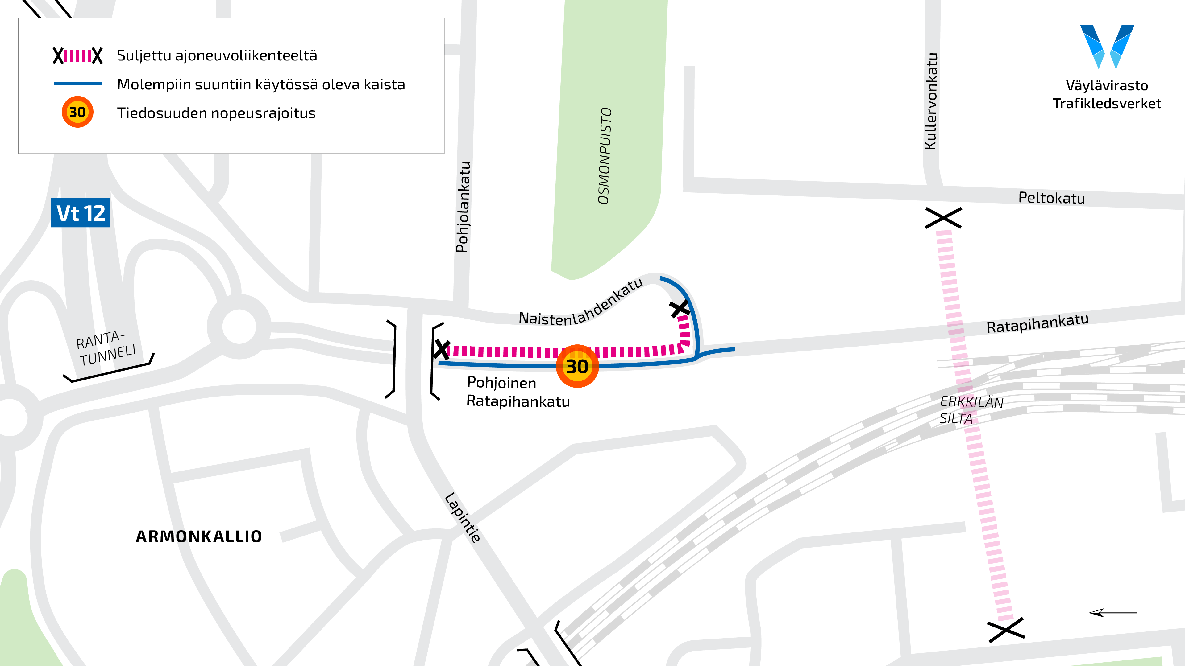 Pohjoisella Ratapihankadulla tehdään hulevesikaivojen ja -linjojen asennuksia viikolla 41. Töiden vuoksi Kastinsillan ja Naistenlahden liittymän välisellä osuudella on yöaikaan klo 21.00–06.00 vain yksi kaista käytössä. Nopeusrajoitus lasketaan 30 km/h alkaen Kastinsillan pohjoispuolelta Pohjoisella Ratapihankadulla päättyen Ratapihankadun ja Åkerlundinkadun risteykseen.*