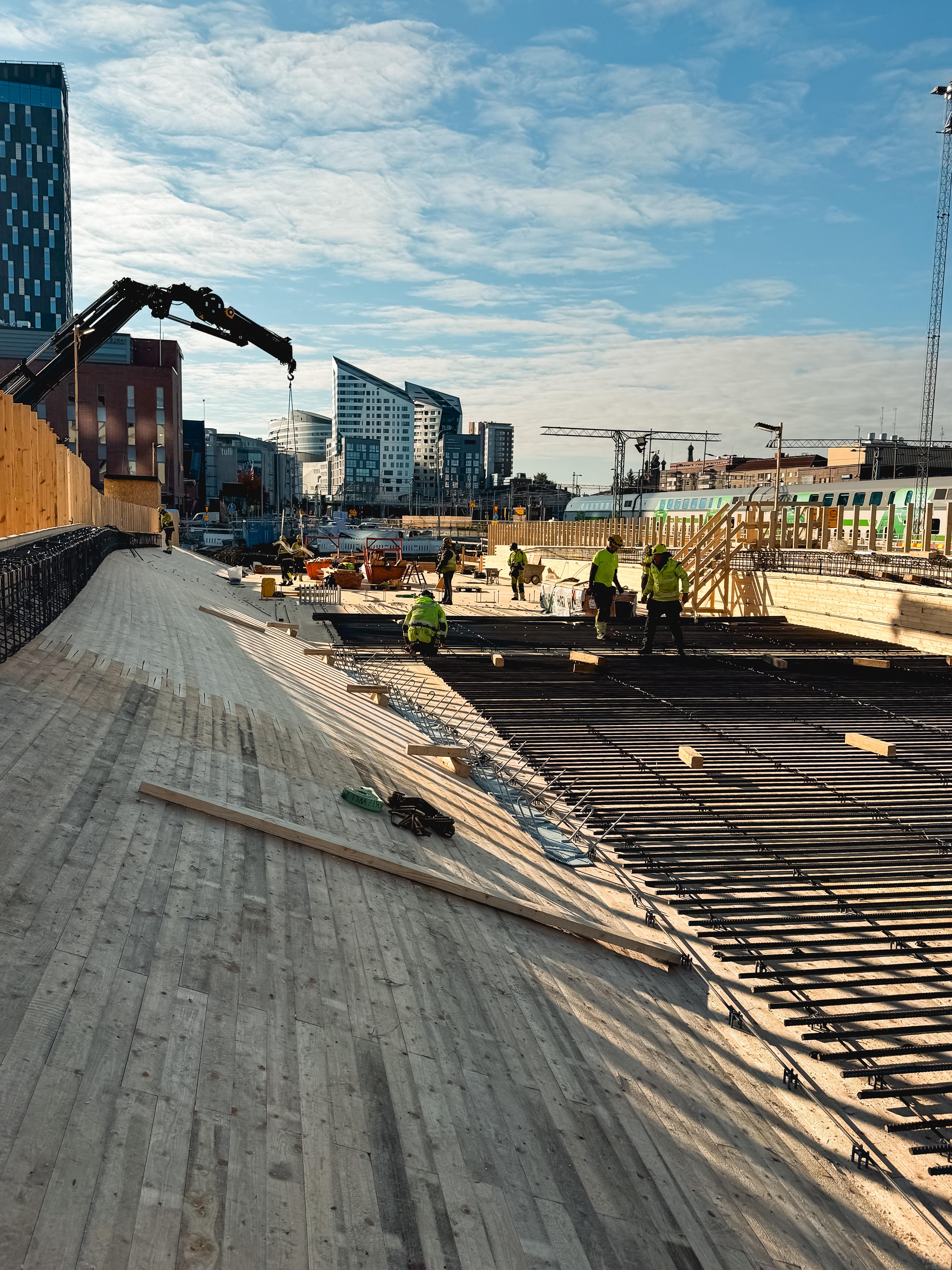 – Sillan alla kulkevan ratikan suojarakenteiden vuoksi kannen muotti rakennettiin reilun metrin sillan lopullista sijaintia korkeammalle. Muotin purun jälkeen silta tunkataan alas, kertoo Siuko.
