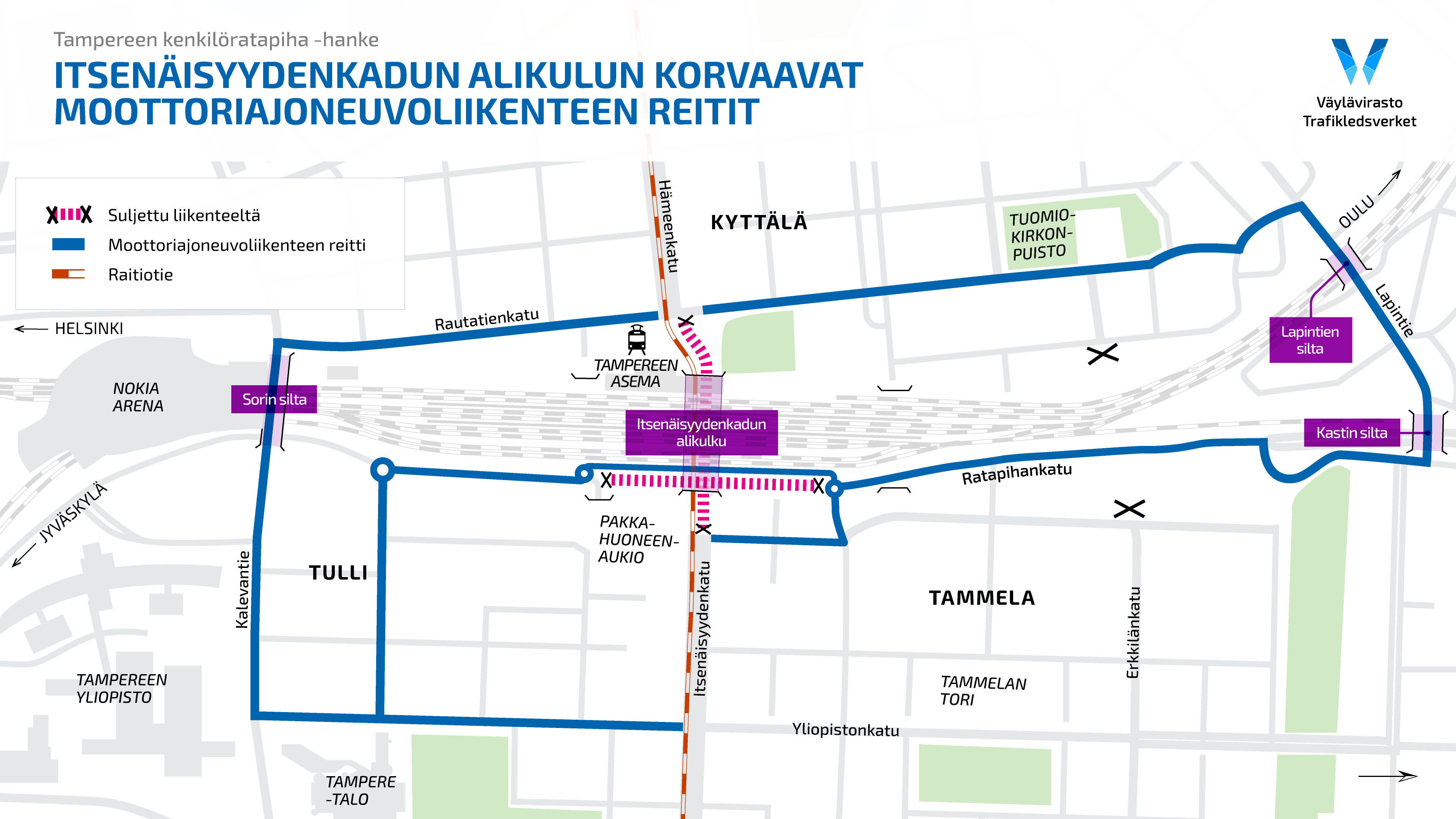 Itsenäisyydenkadun alikulku: Suljetaan kävelyltä, pyöräilyltä ja moottoriajoneuvoilta 1.6 –5.8.2025, mutta avataan autoilijoille talveksi. Ratikka kulkee alikulun läpi koko hankkeen ajan.